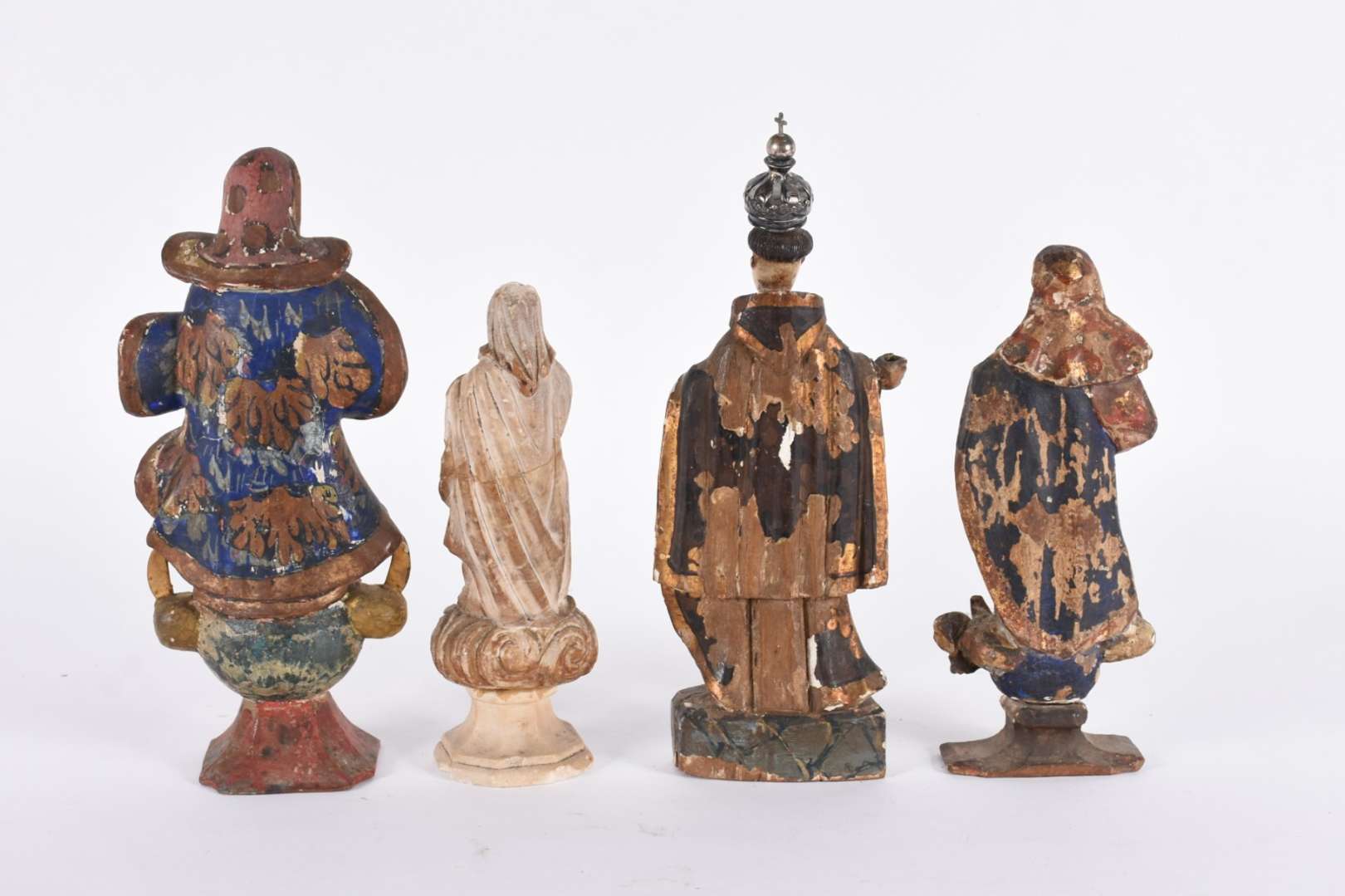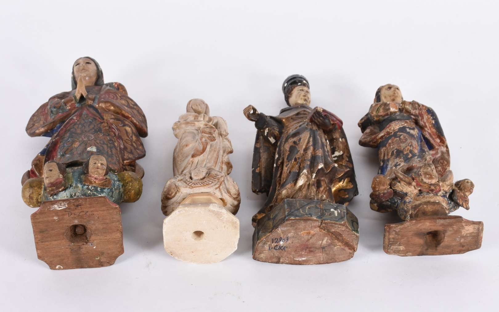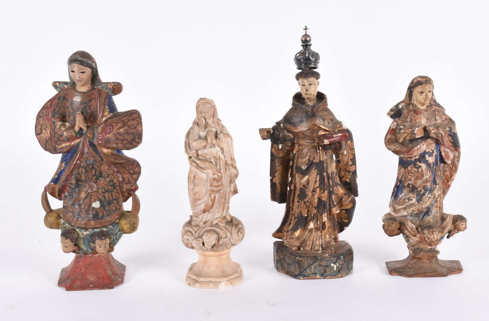 Quatro antigas imagens, sendo tres de madeira policromada representando Nossa Senhora da Conceição e Santo com coroa, e uma Nossa Senhora de pedra sabão (quebrada e colada).