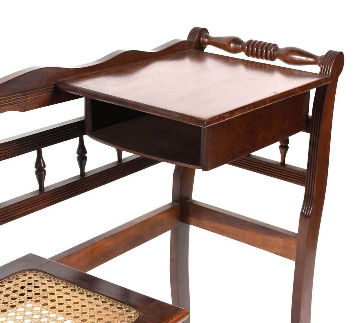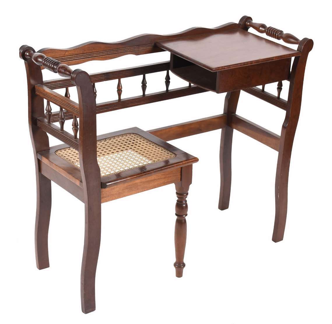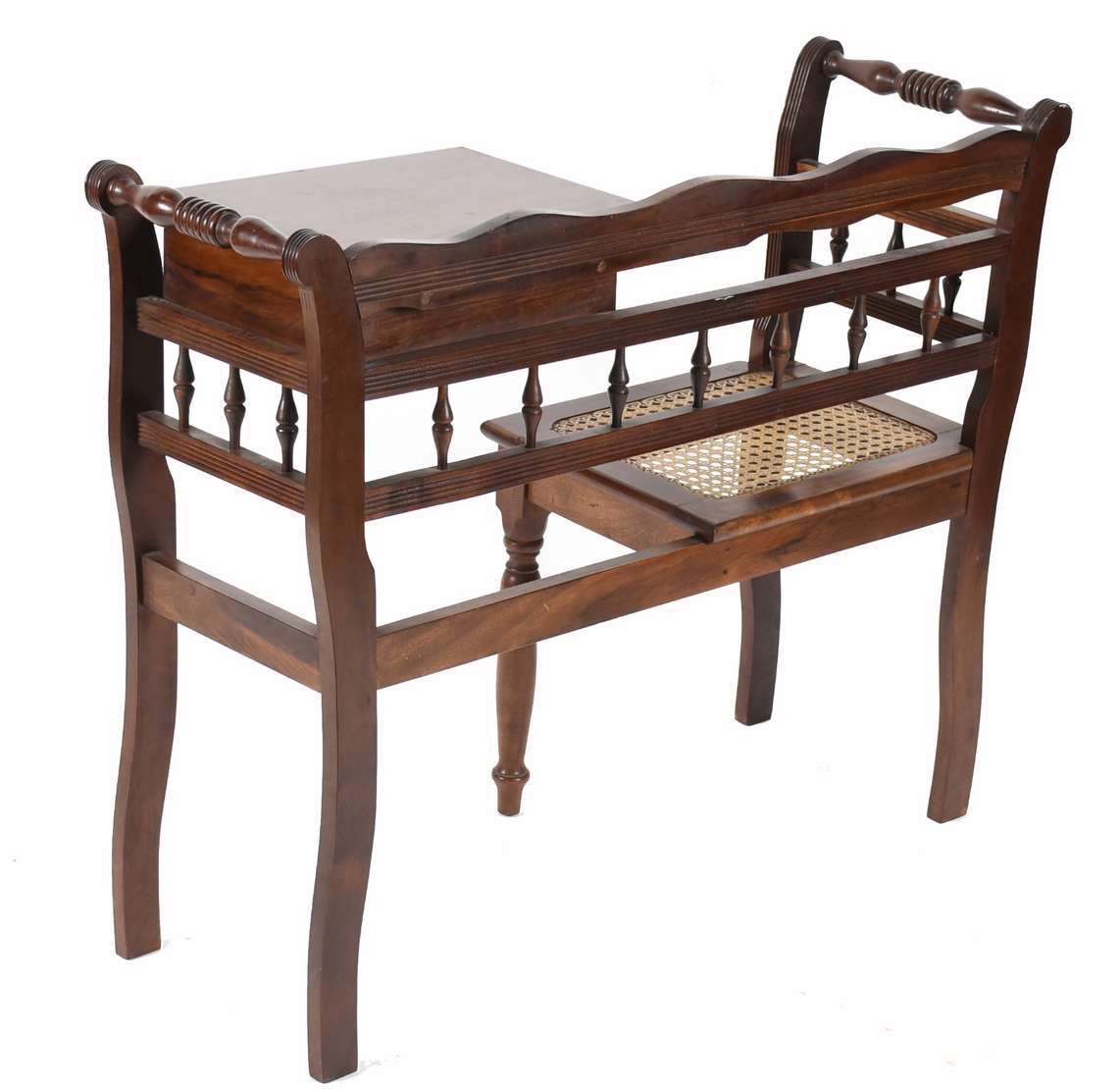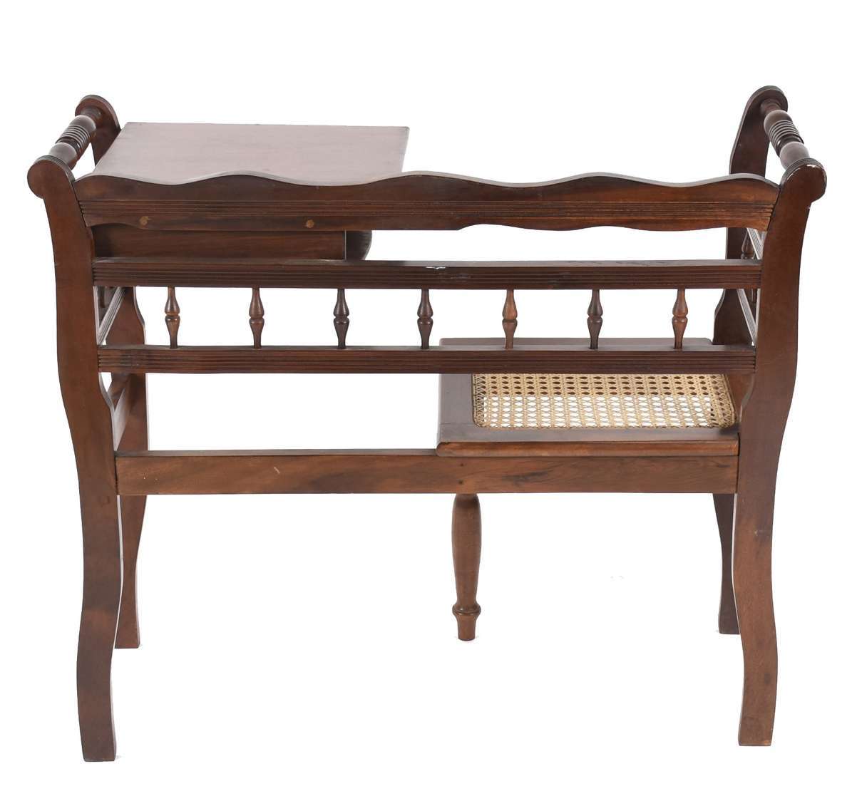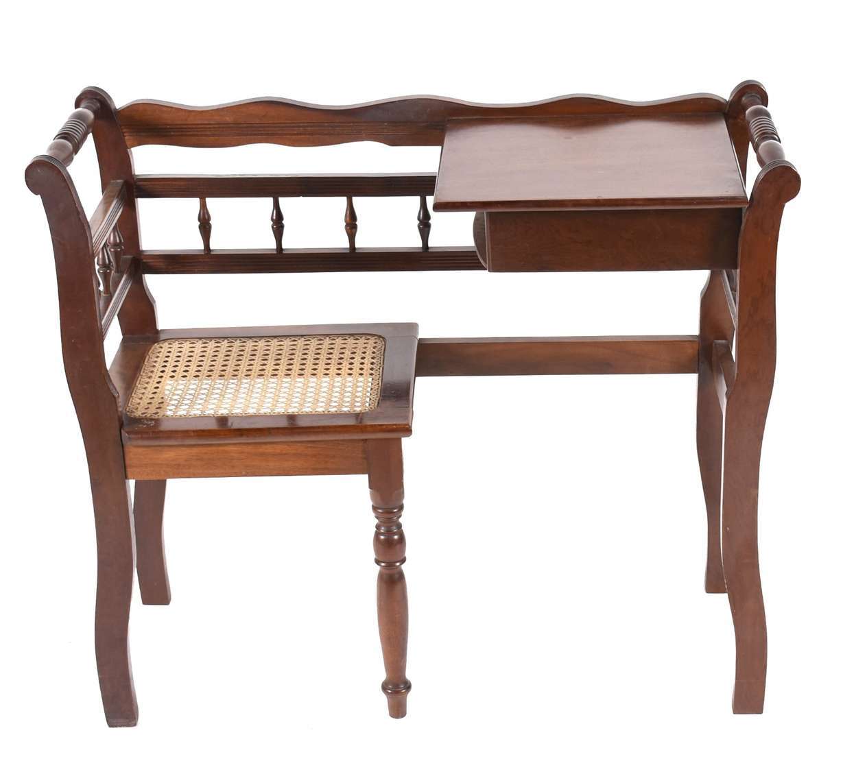Mesa auxiliar de madeira nobre, saia recortada e pernas entalhadas, uma gaveta.
