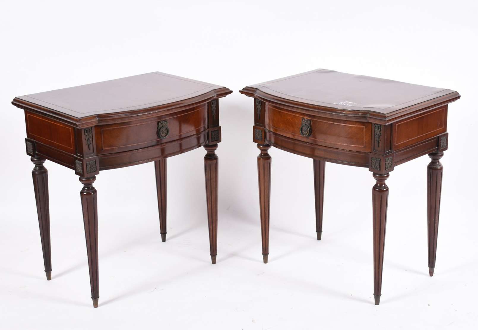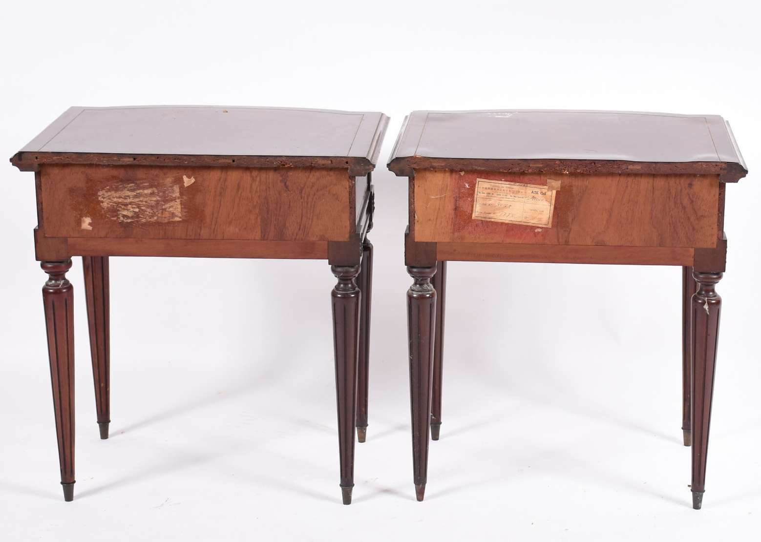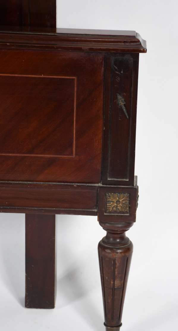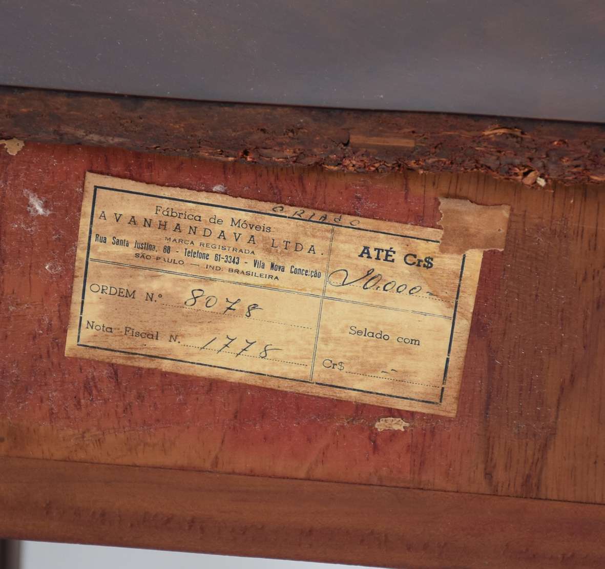 Mesa auxiliar de madeira nobre, tampo marchetado com gradinha de metal, duas gavetas e pernas cilíndricas com detalhe...