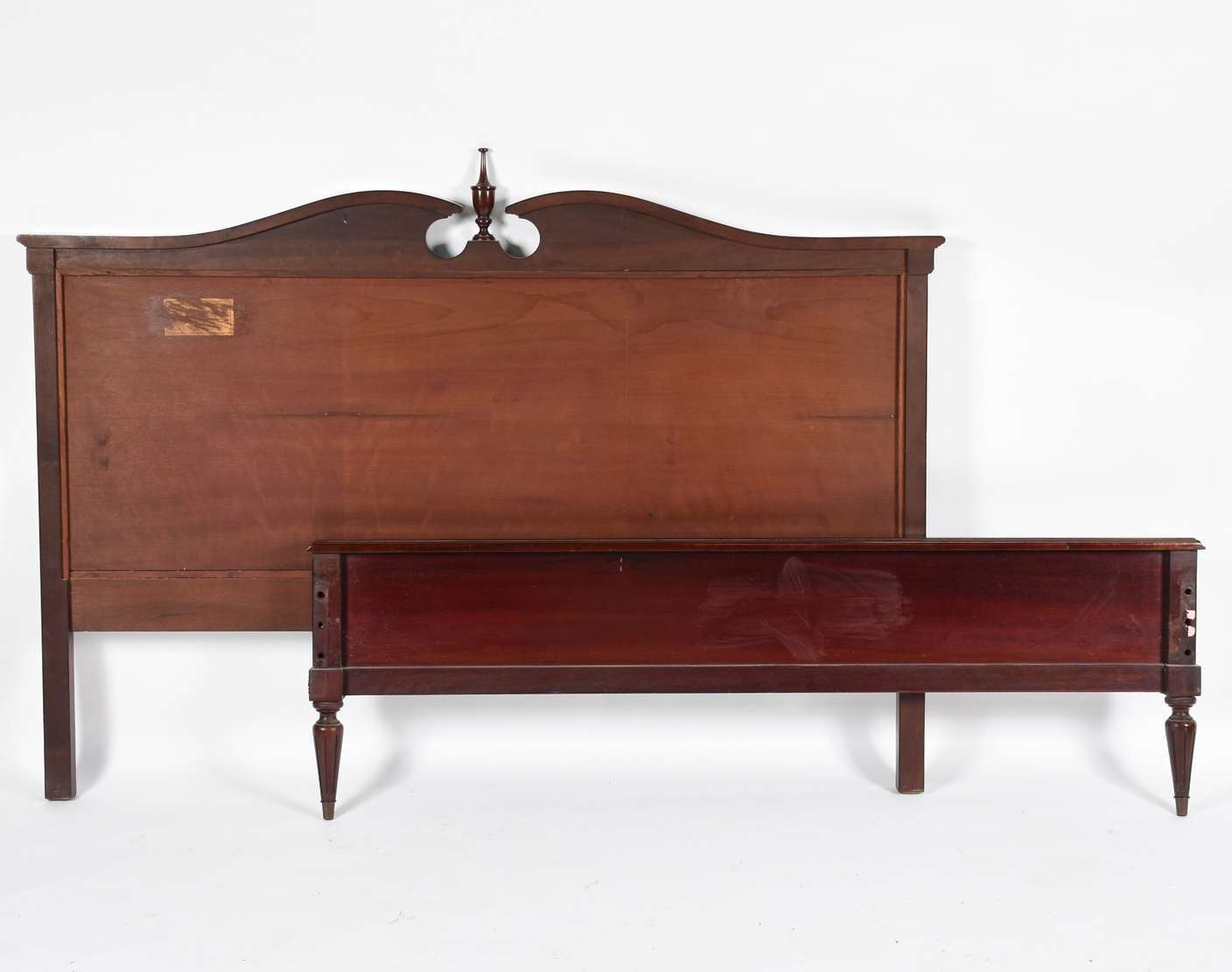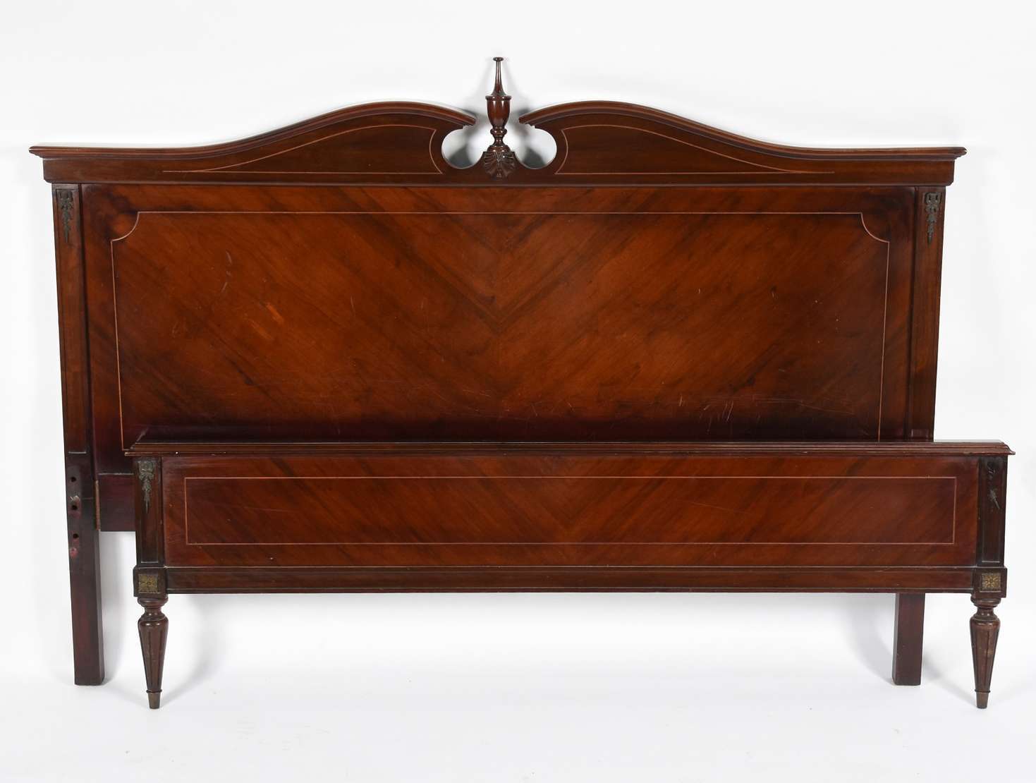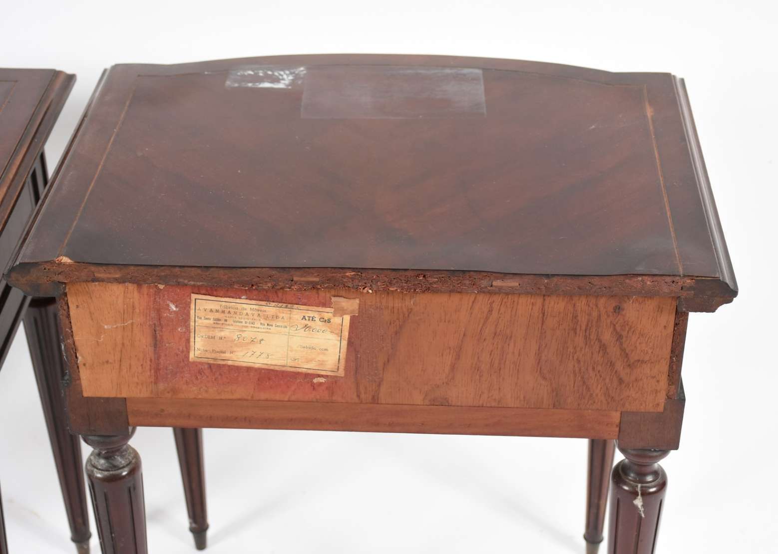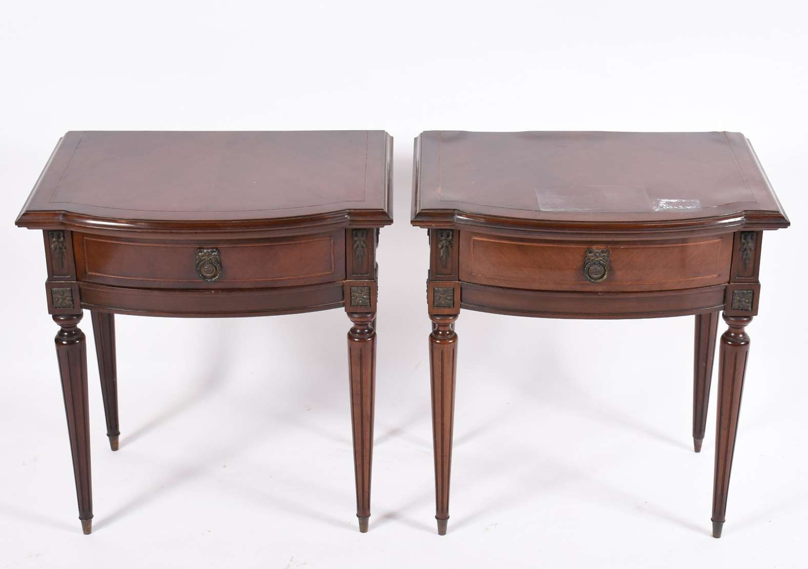 Mesa auxiliar de madeira nobre, tampo marchetado com gradinha de metal, duas gavetas e pernas cilíndricas com detalhe...