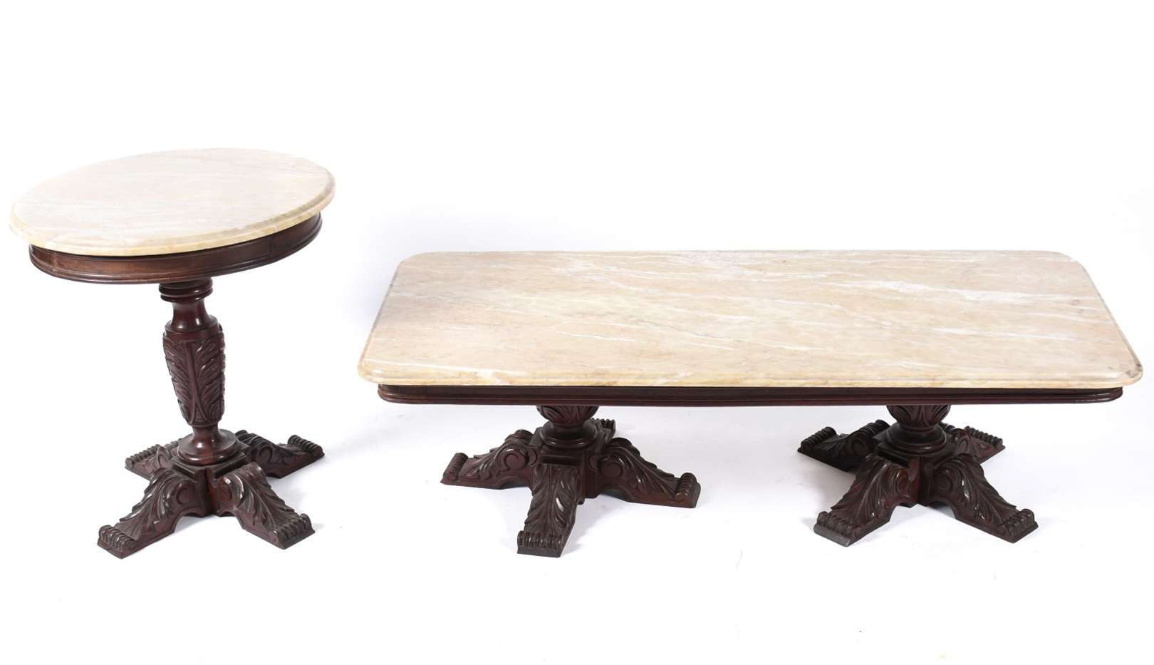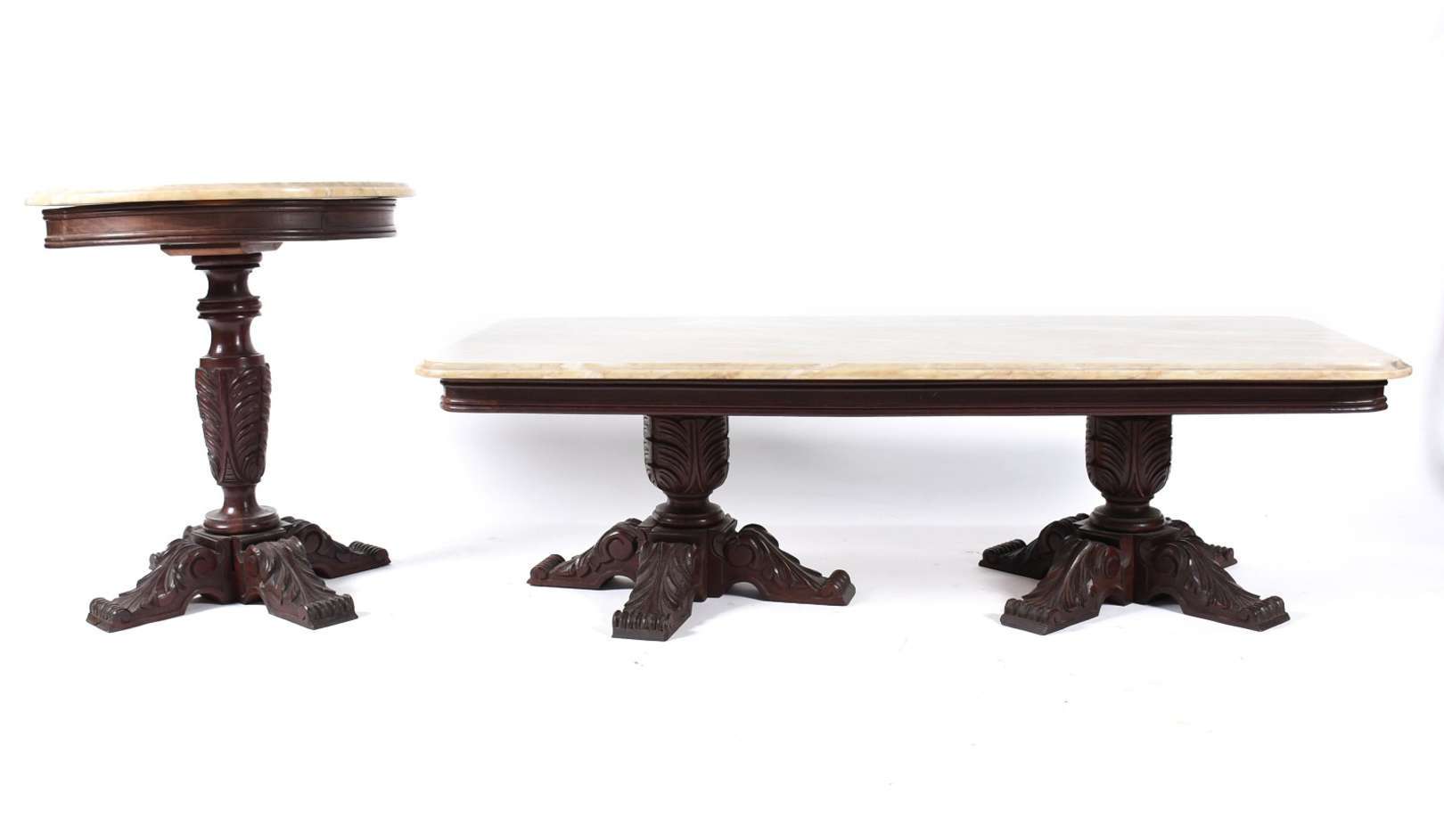 Grande mesa de centro de madeira nobre, tampo retangular com duas gavetas, puxadores feitio argolas de metal, pernas ...