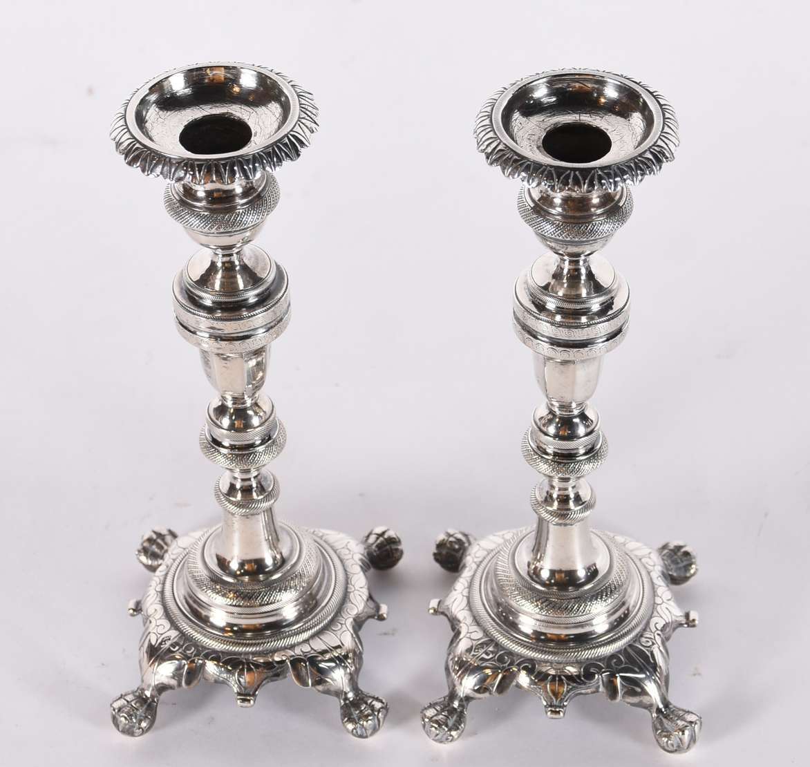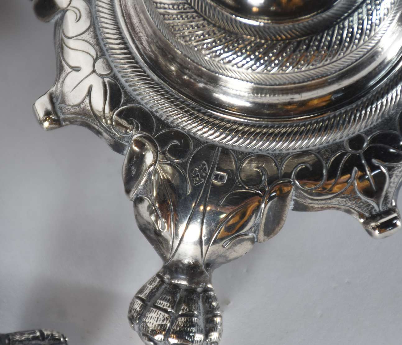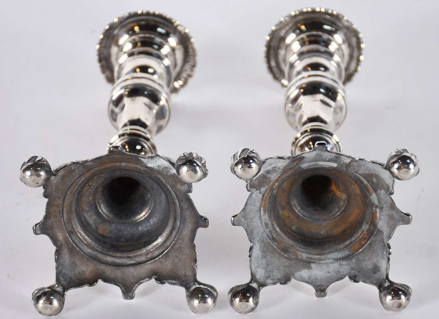 Par de castiçais/tocheiros de metal prateado ricamente trabalhados com flores e guirlandas em relevo.