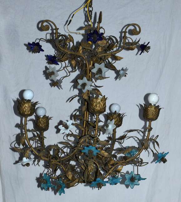 Lustre de bronze com flores de opalina azul.