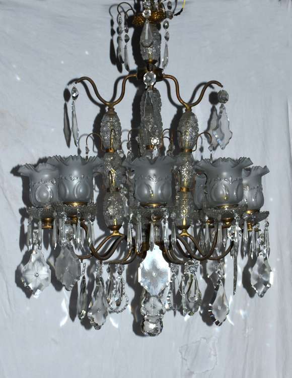 Lustre para 8 luzes com estrutura de metal e pingentes de cristal lapidado, mangas foscas feitio babado. Faltando alg...