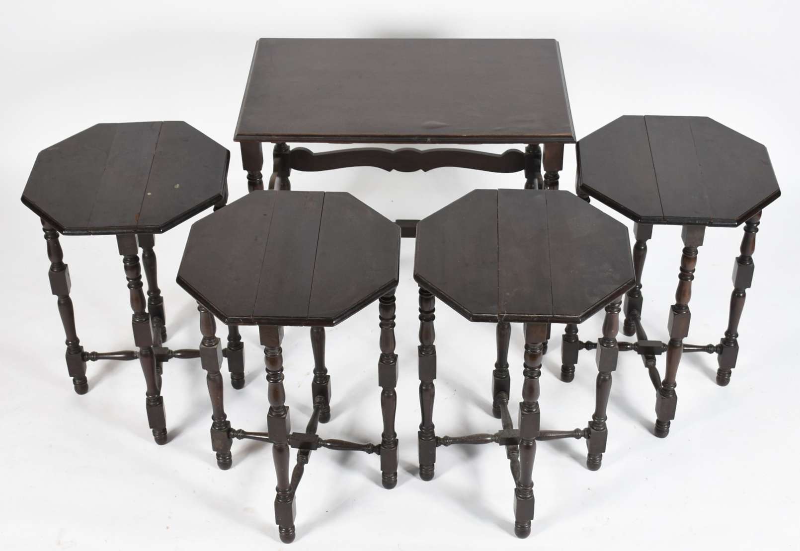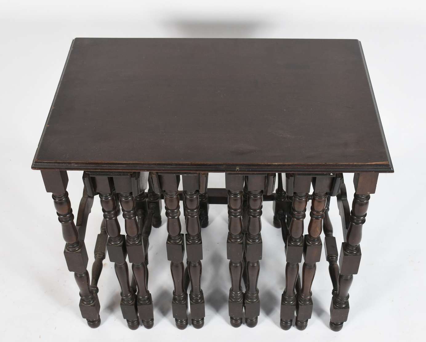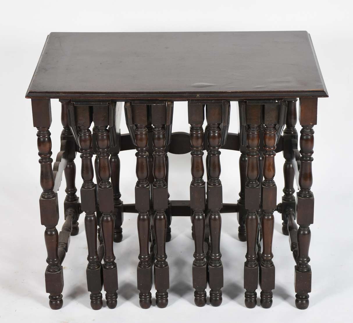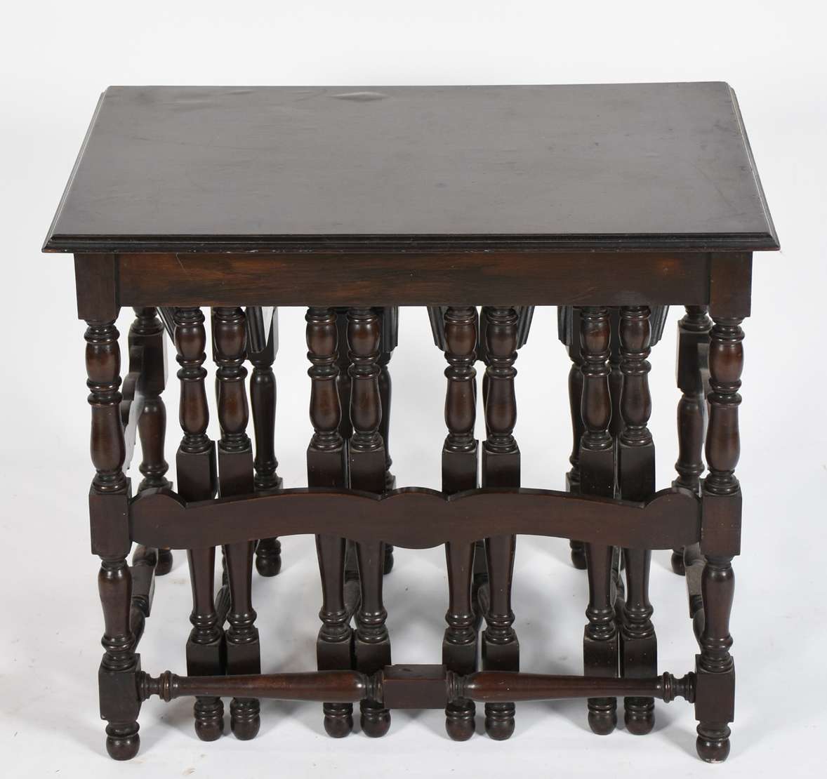 Carrinho de chá de jacarandá, abas laterais, platô inferior com cercadura de pinos torneados, sobre rodízios (tampo c...
