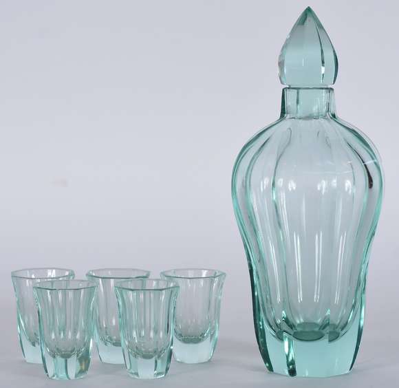 Licoreira de cristal tcheco na cor verde com 5 copinhos (bicado no bocal da garrafa e num dos copos).