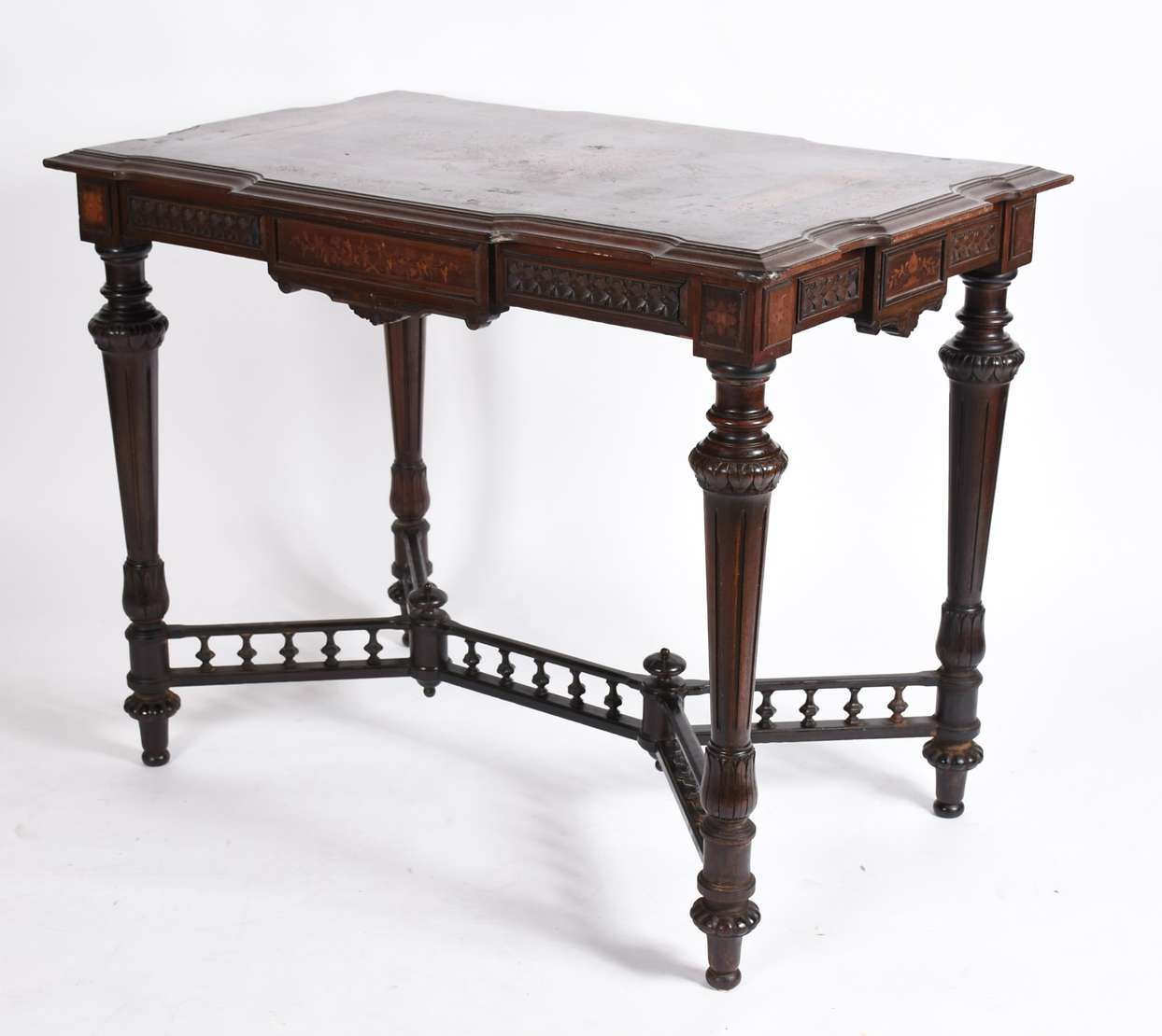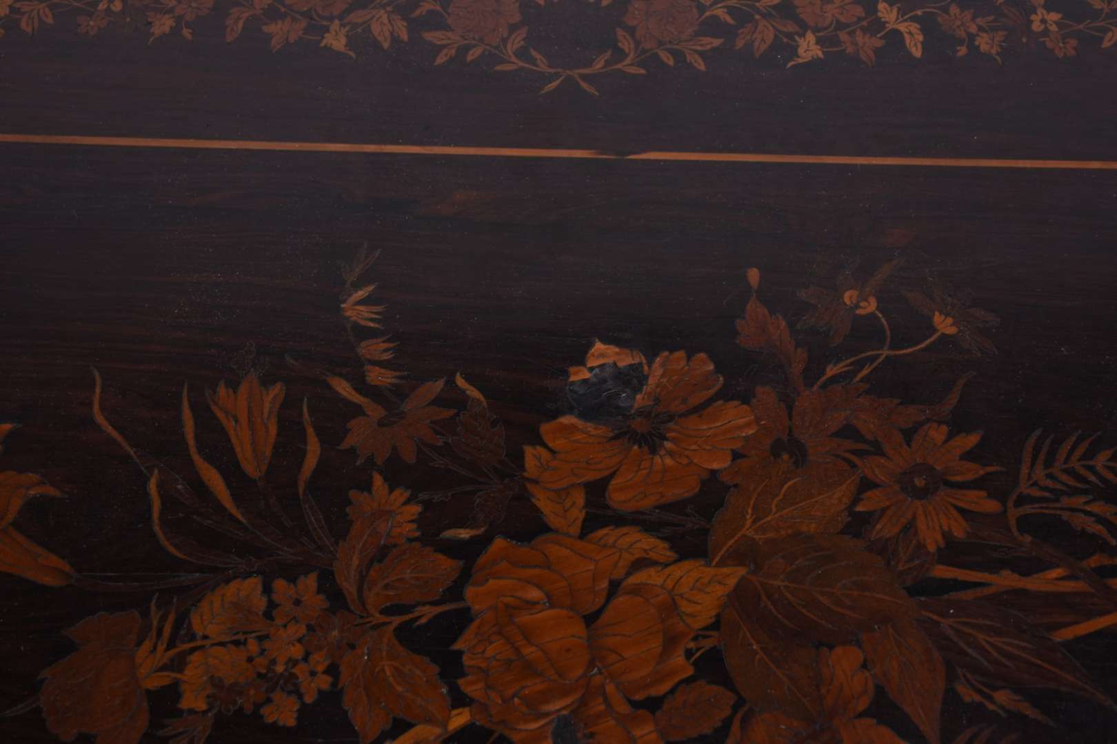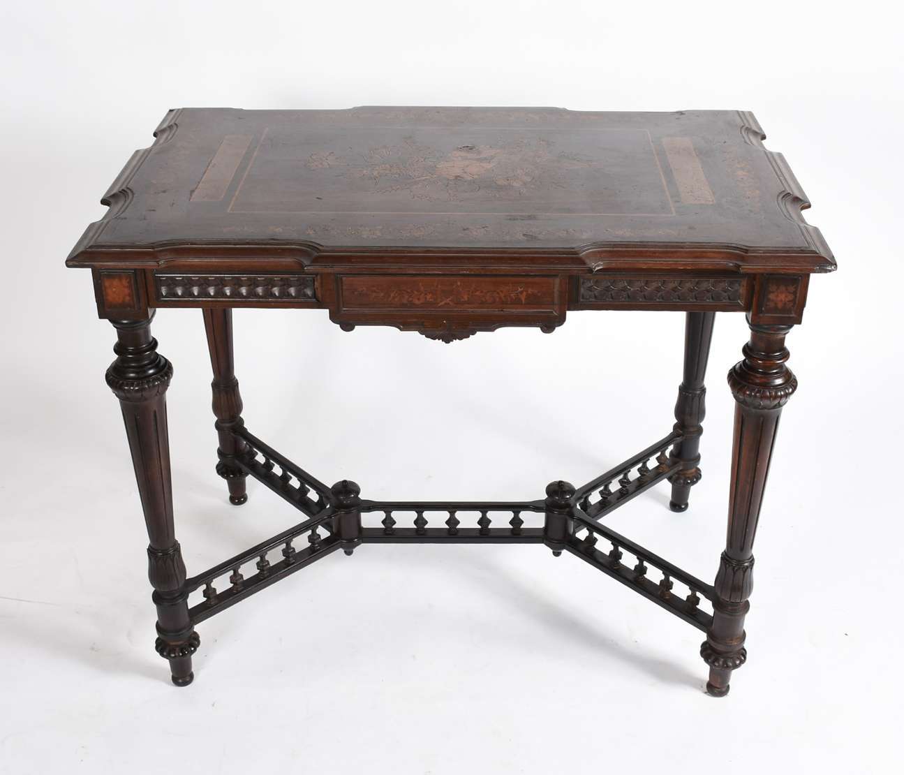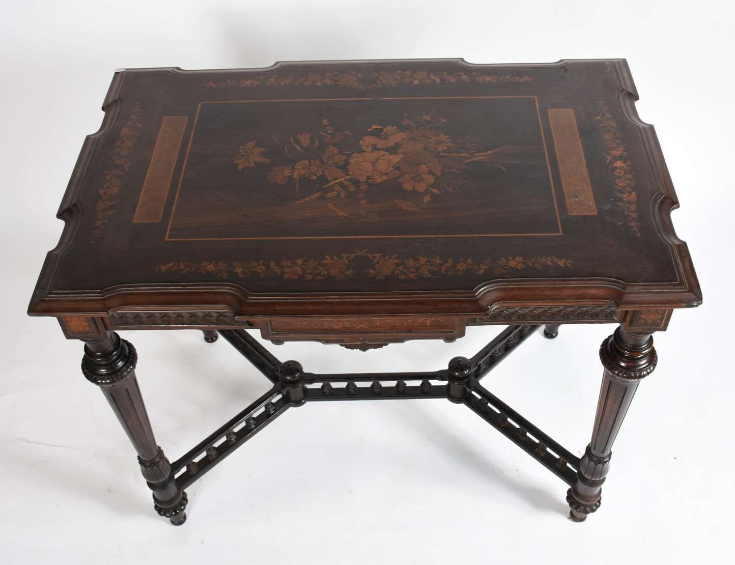 Mesa de centro de madeira com tampo trabalhado em marqueterie, platô inferior, galeria de metal dourado vazado, perna...