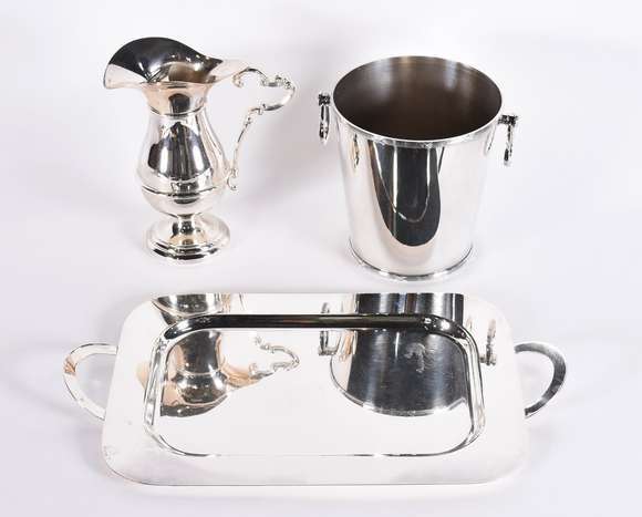 Três peças de metal prateado, sendo: bandeja com alças, wine cooler Wolff e jarra para água.