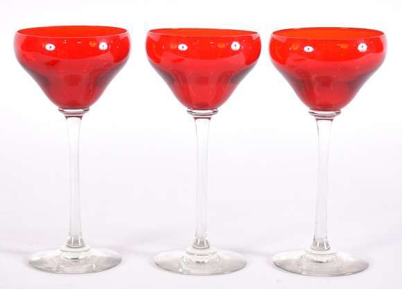 Três cálices para vinho de pé alto de vidro na cor vermelha.