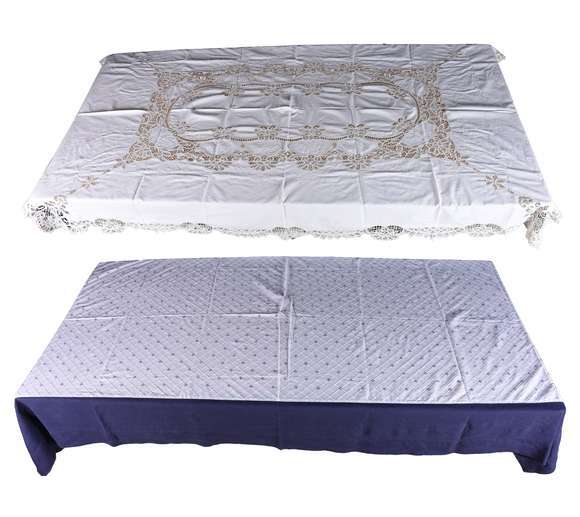 Duas toalhas de mesa, sendo uma bege com bordados e outra de linho azul com bordados.