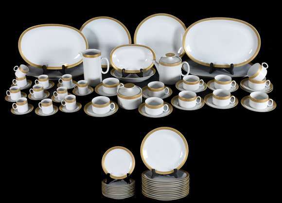 Aparelho de jantar de porcelana Renner com borda dourada composto de:12 pratos rasos,12 xícaras de café com pires,12 ...