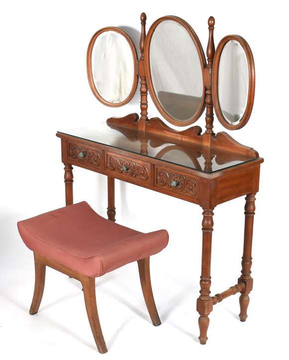 Penteadeira de madeira nobre, corpo retangular com 3 gavetinhas entalhadas, pernas cilíndricas torneadas, encimada po...