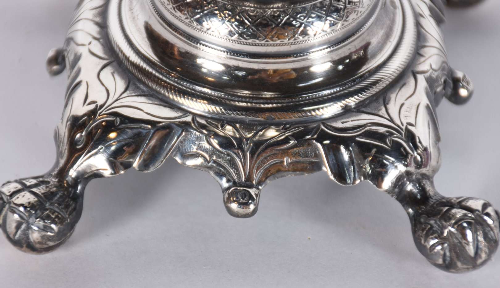 Par de castiçais/tocheiros de metal prateado ricamente trabalhados com flores e guirlandas em relevo.