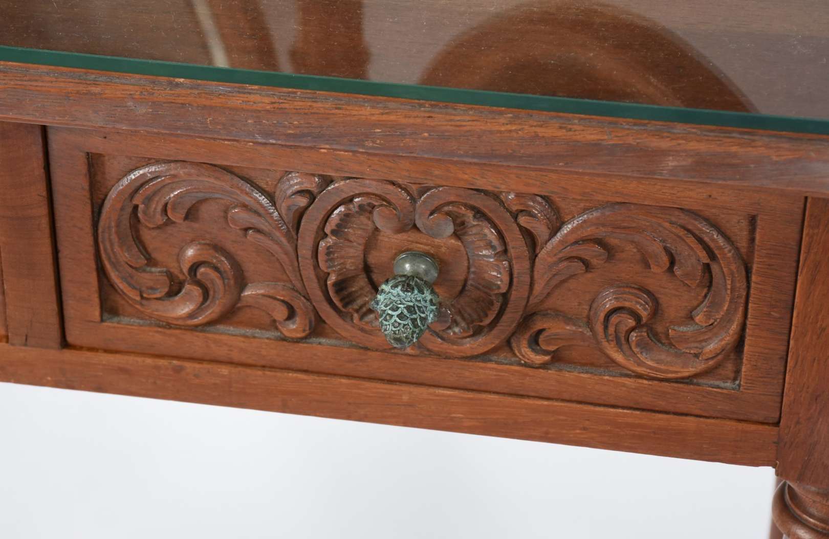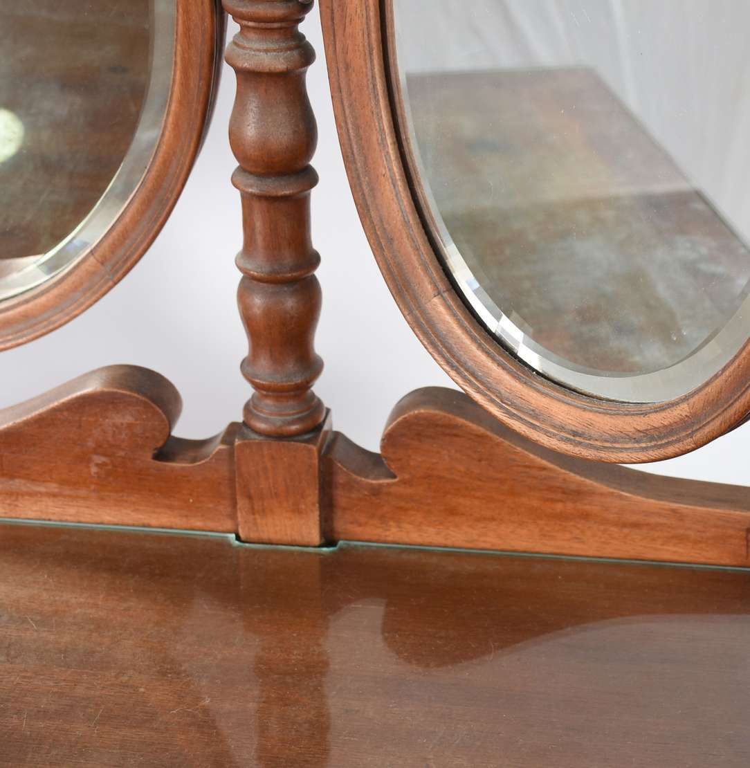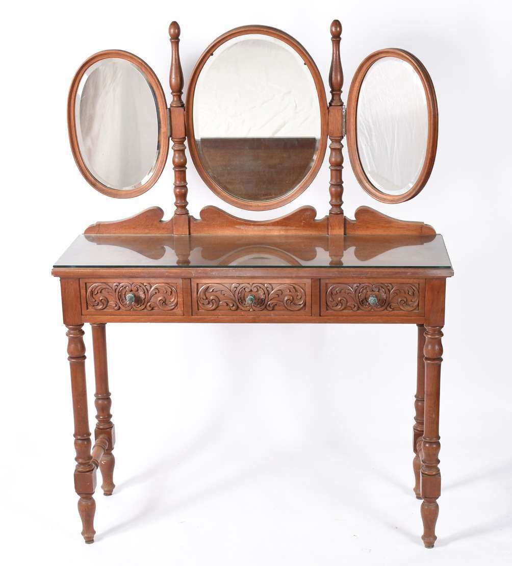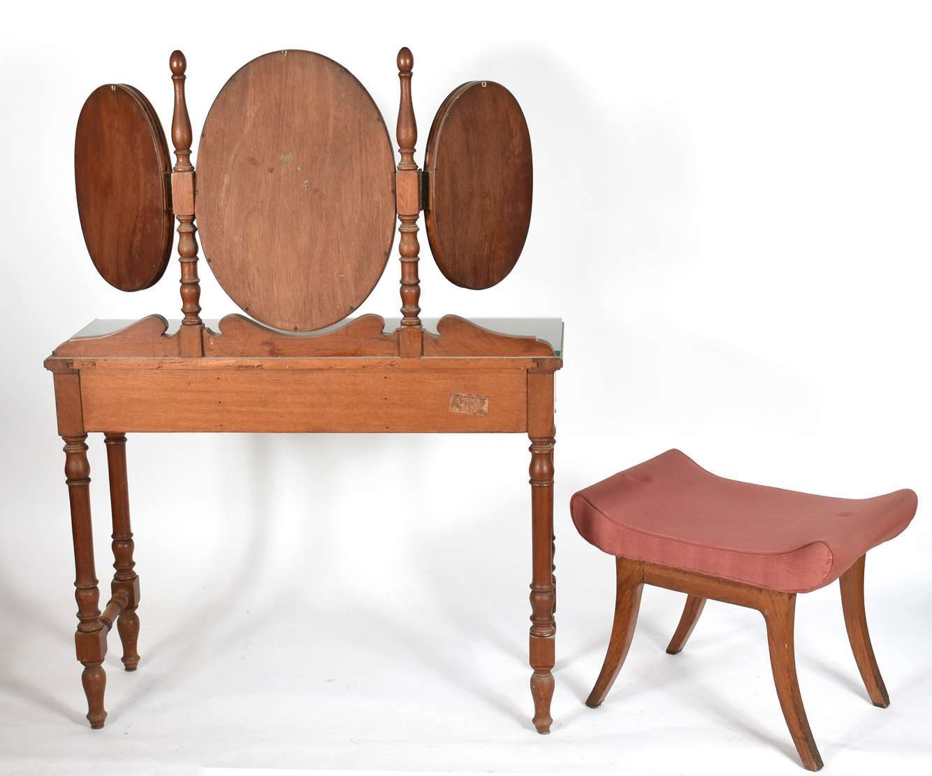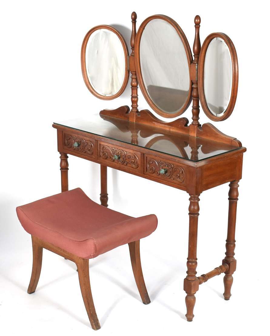 Penteadeira de madeira nobre, corpo retangular com 3 gavetinhas entalhadas, pernas cilíndricas torneadas, encimada por tres espelhos ovais de cristal bisotado, acompanha banqueta com assento estofado.