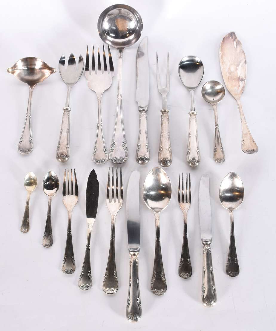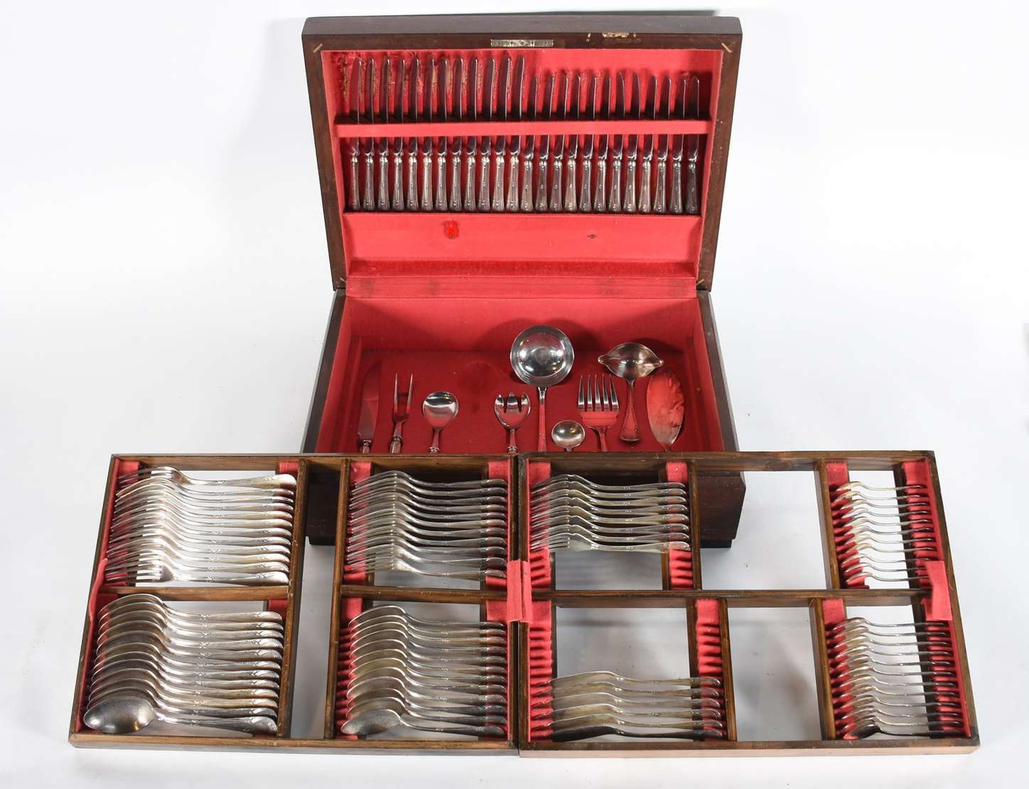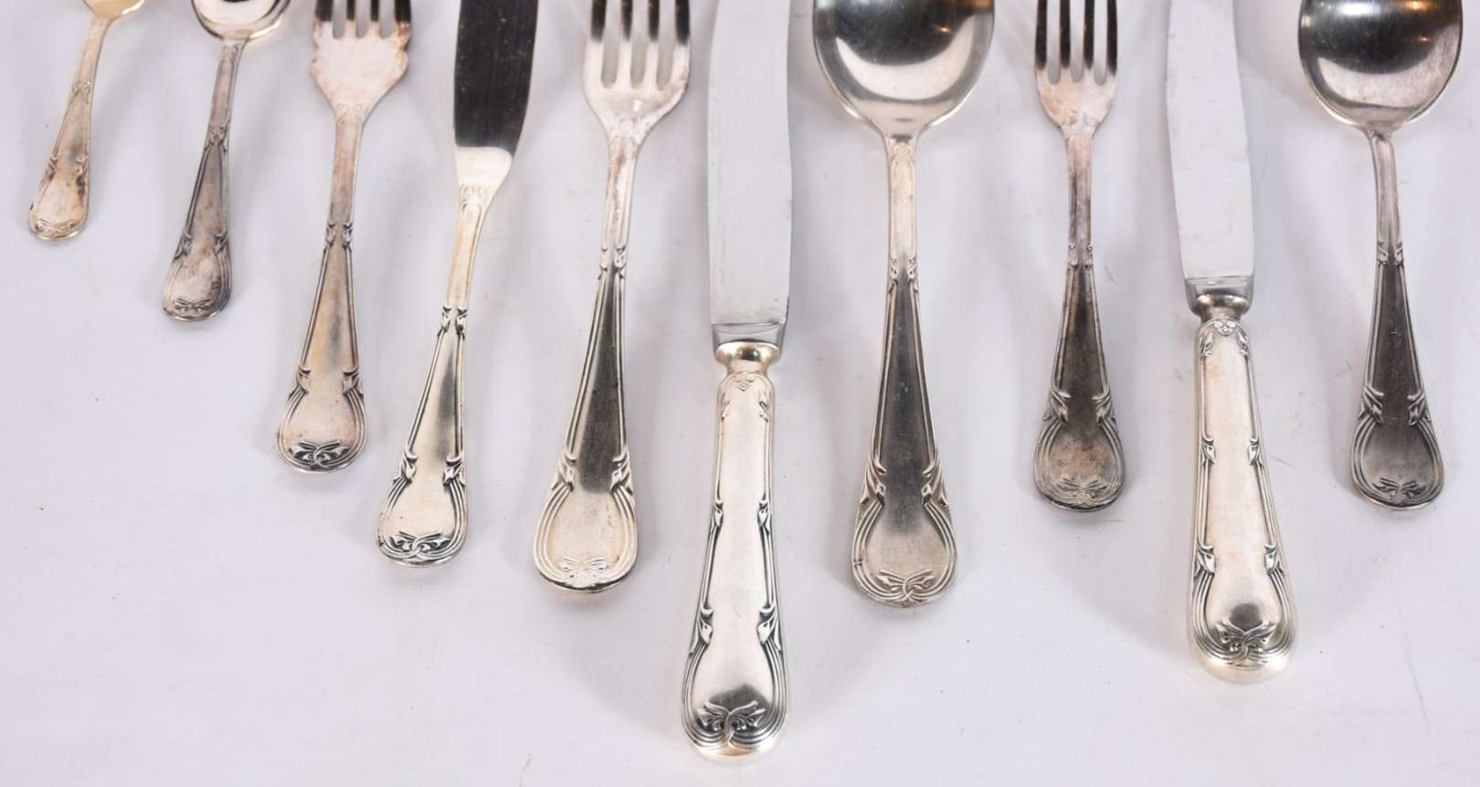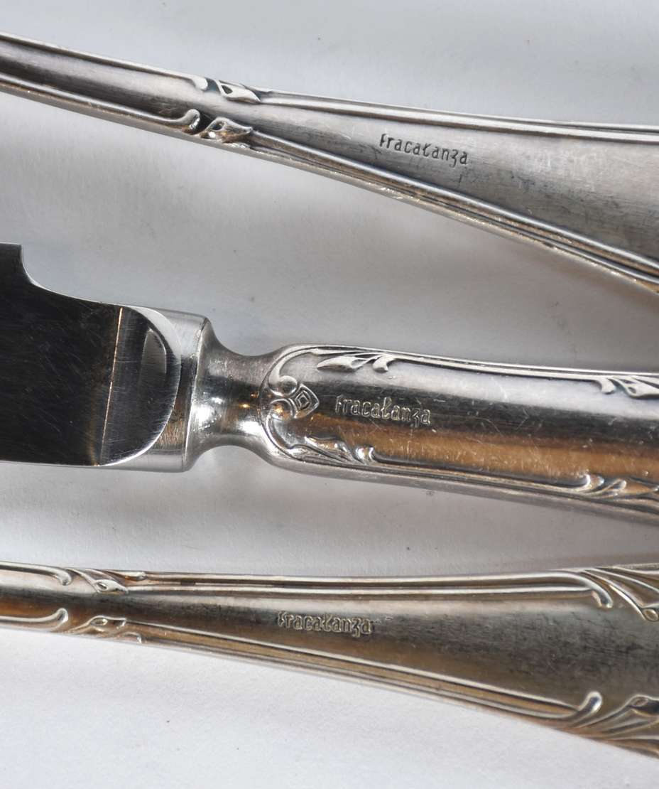 Faqueiro de aço inox Meridional, composto de:6 garfos, 11 colheres, 9 facas grandes; 12 garfos, 12 facas, 11 colheres...