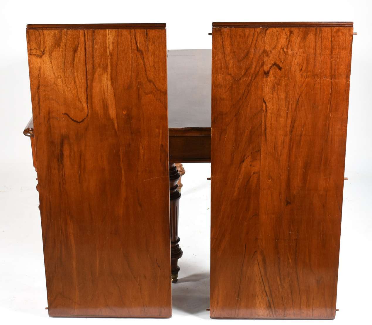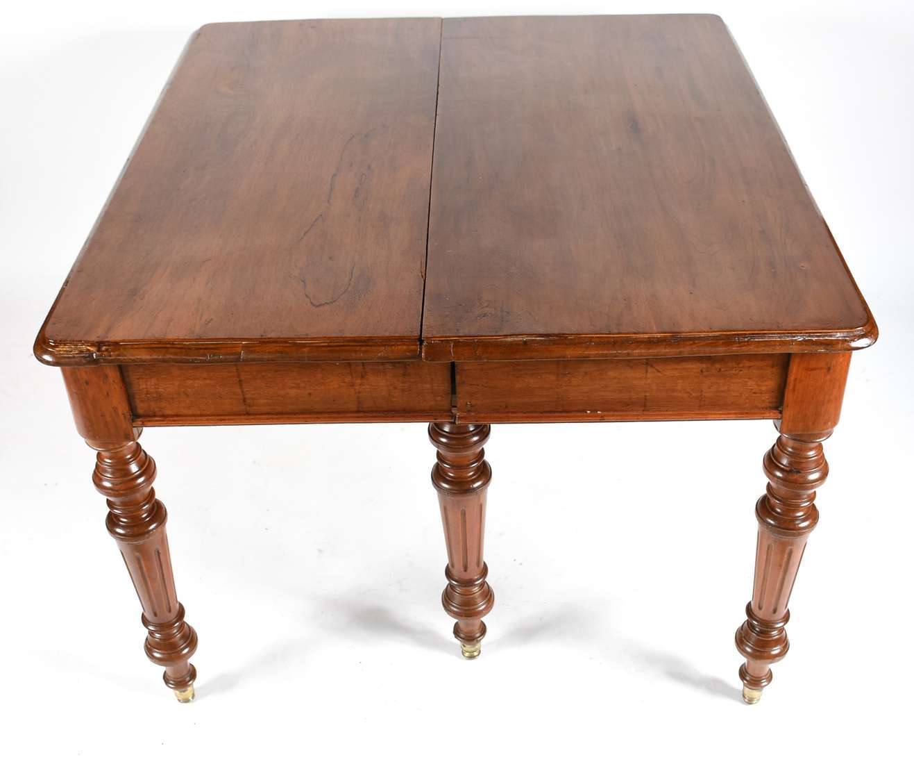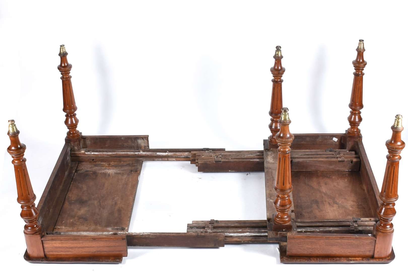 Mesa de jantar de madeira nobre com 2 tábuas extensoras, pernas cilíndricas (med.120 cm x 50 cm cada tábua). Obs. Hastes internas de madeira por onde correm as tábuas estão precisando de reparos, a mesa não foi montada toda aberta pois não "suportou" o peso.