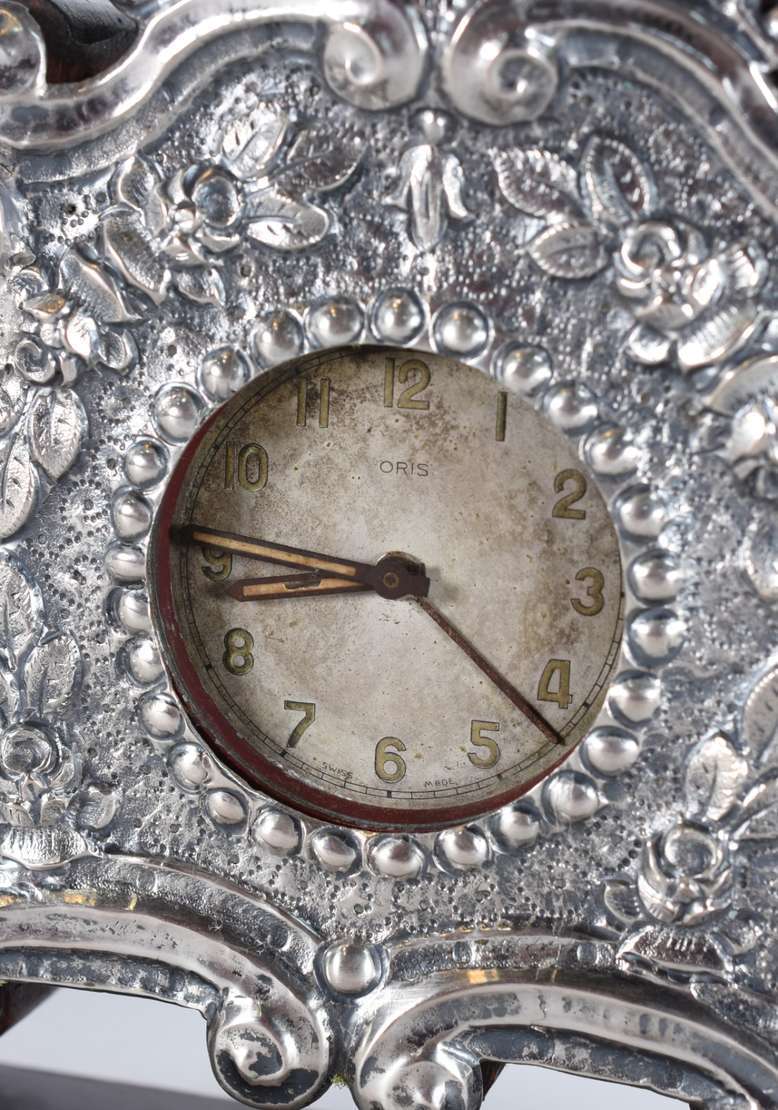 Espelho de mesa com moldura de porcelana e aplicações de flores em relevo policromado.