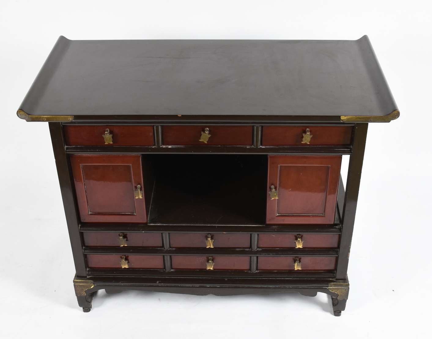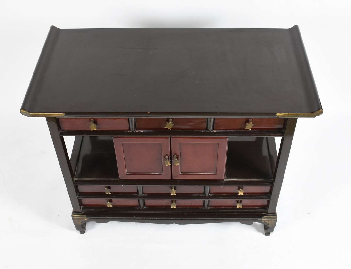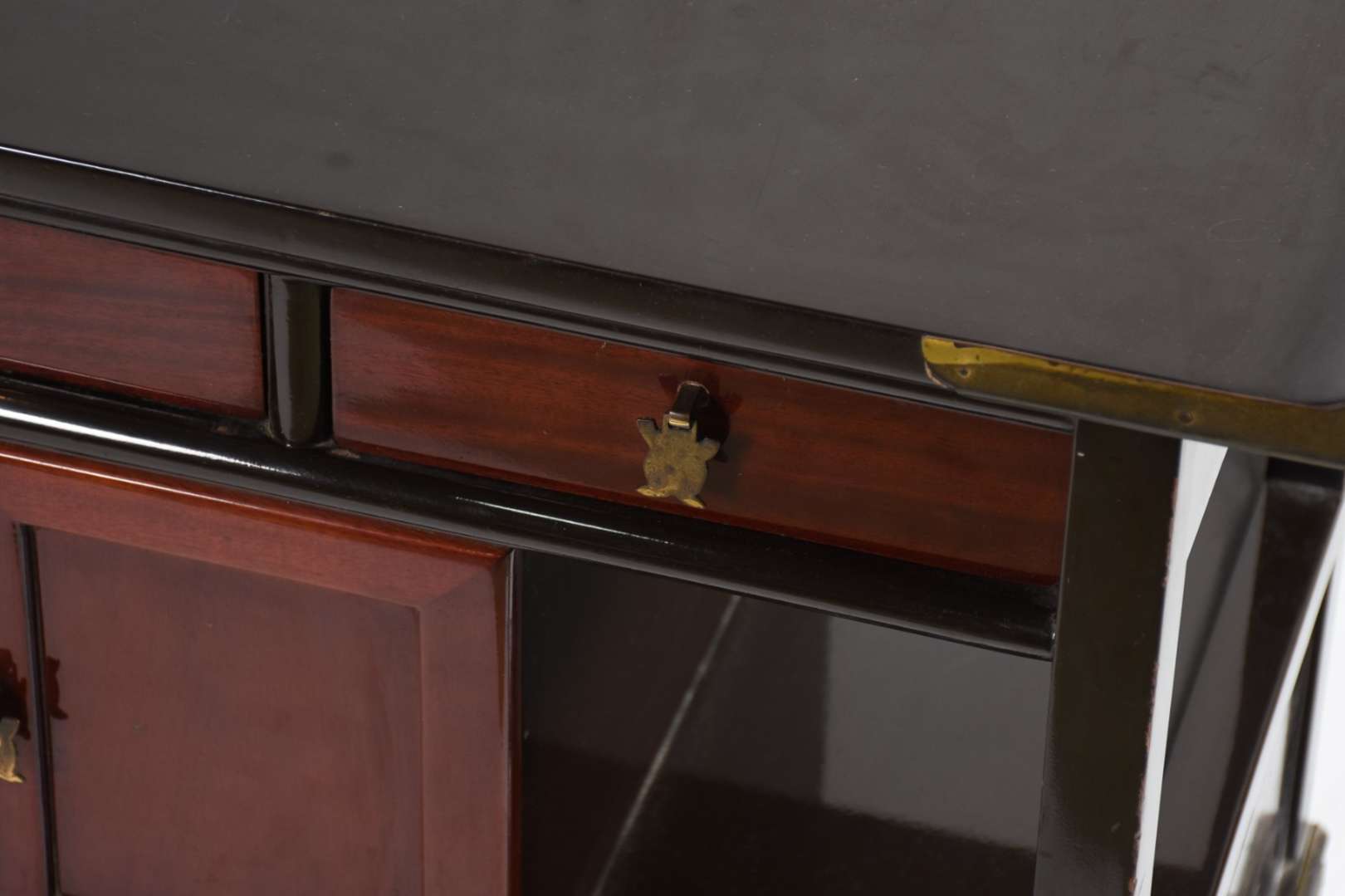 Móvel de madeira nobre com tampo retangular e duas gavetas, apoio em quatro pernas torneadas, alçada com duas portas ...