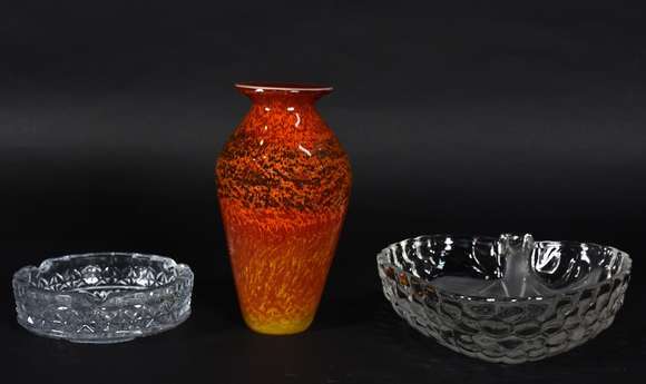 Três peças de vidro, sendo: vaso vermelho, bowl cacho de uva e cinzeiro.