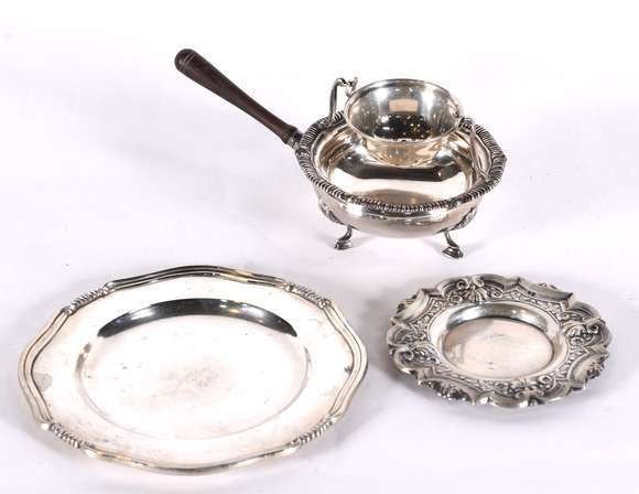 Três peças de prata de lei contrastada, sendo: coador de chá e 2 salvas. Peso total: 330 g (Por motivos de segurança...