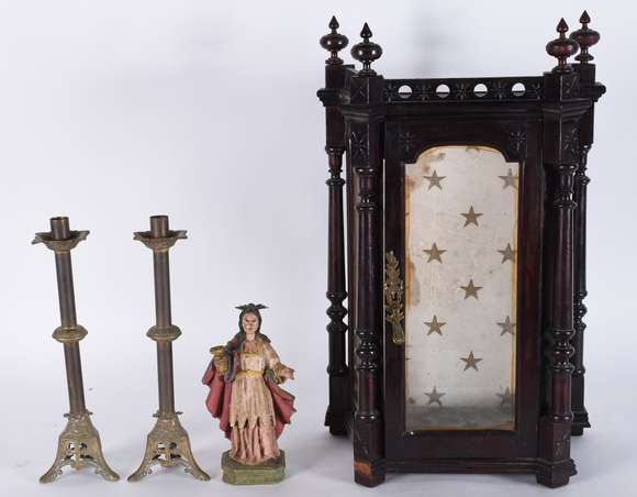 Três peças diversas, sendo: pequeno oratório de madeira com porta e laterais de vidro (pequenos desgastes na madeira)...