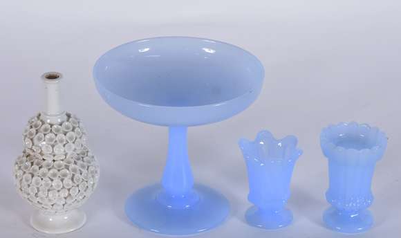 Diversas peças, sendo: pequena fruteira, 2 vasinhos opalina azul e pequeno vaso de porcelana branca com flores. Total...