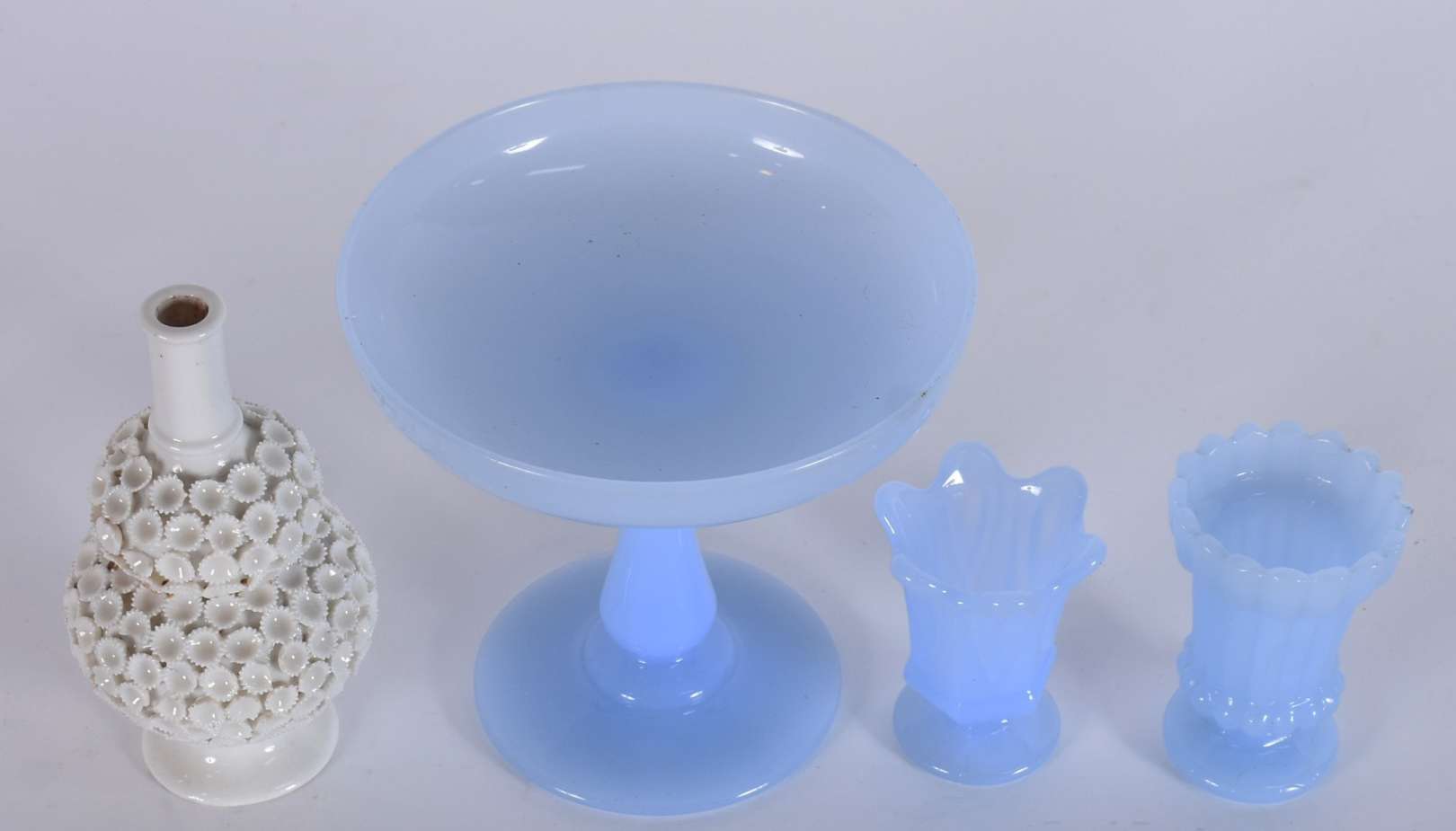 Duas peças de vidro leitoso trabalhado em relevo, sendo cachepot na cor azul e vaso amarelo com cachos de uvas.