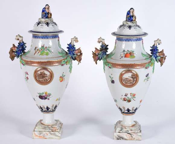 Par de urnas com tampas em porcelana europeia, de formato balaústre, ornadas em esmaltes policromados com flores e fr...