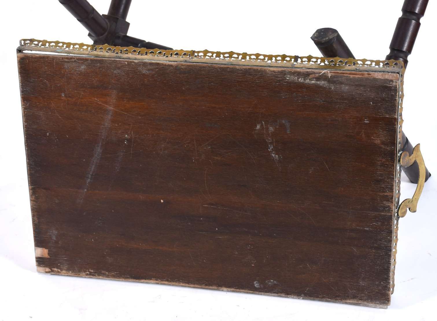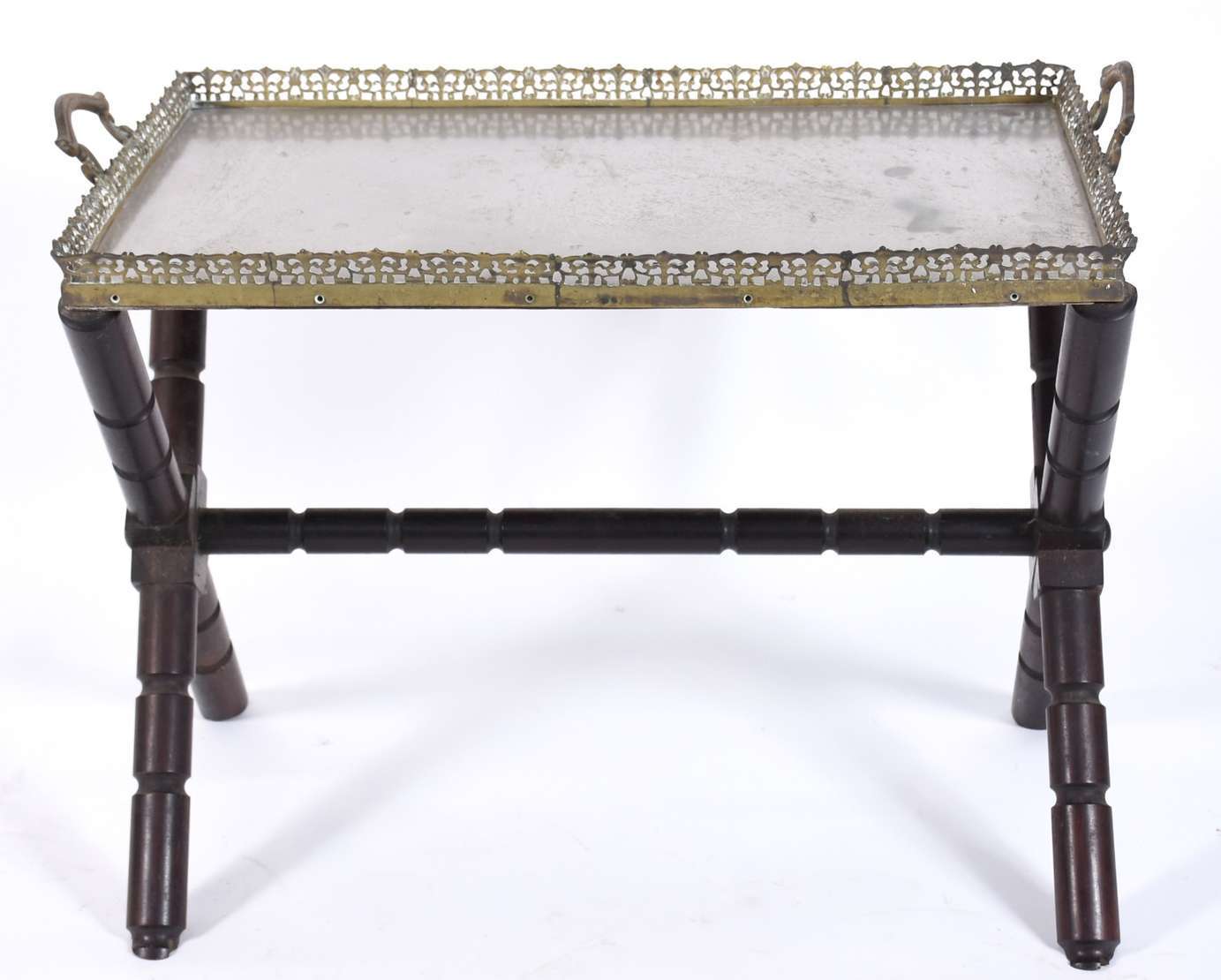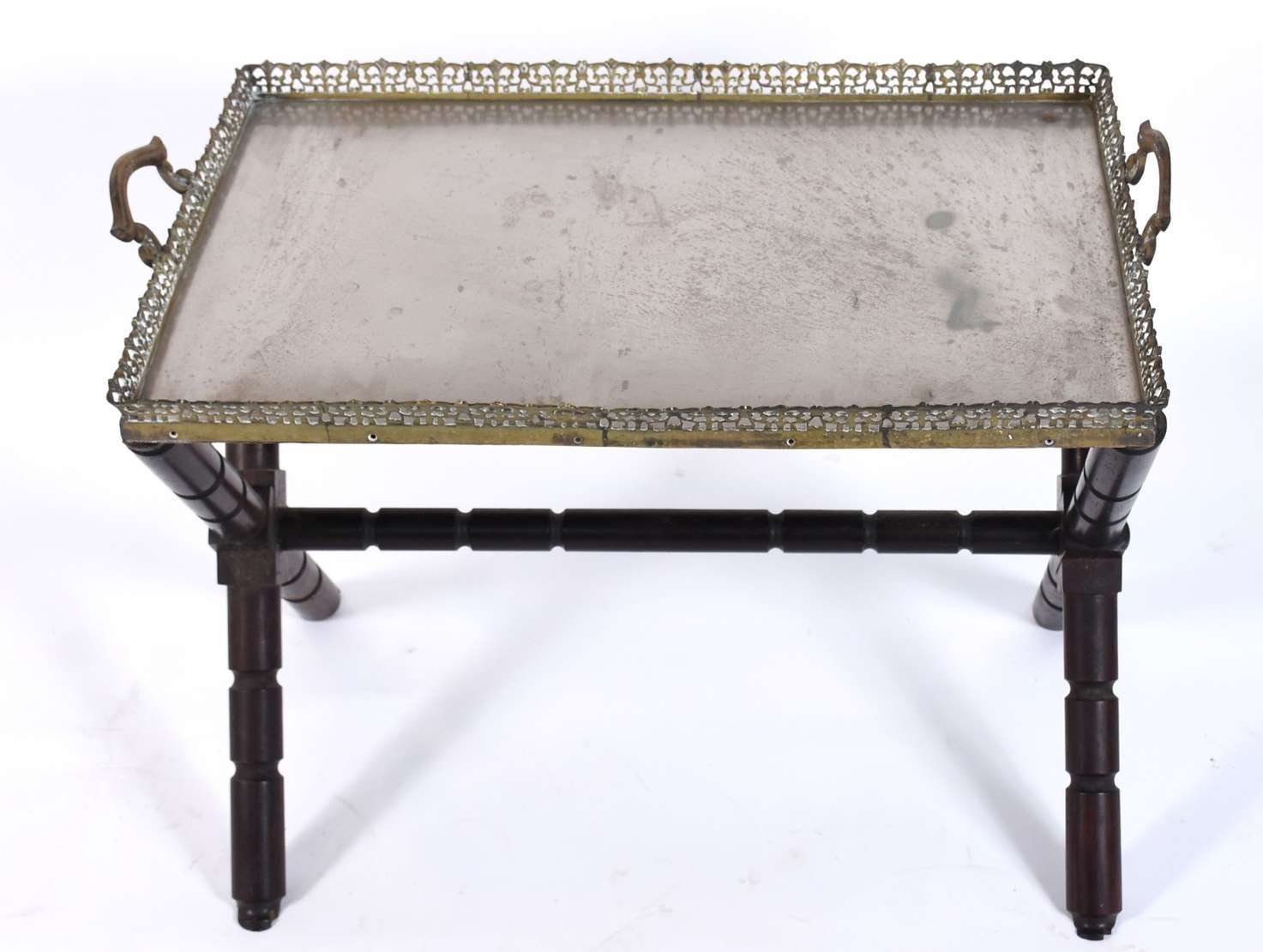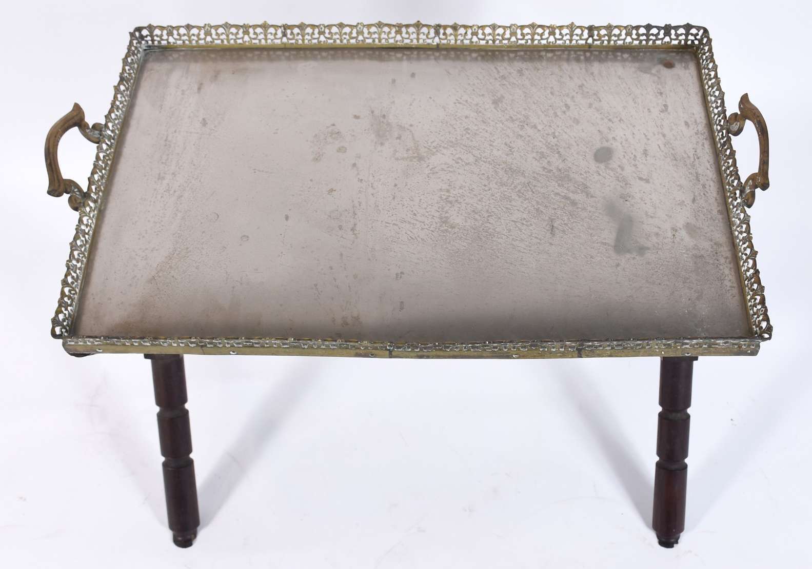 Mesa cavalete com base de madeira e tabuleiro de metal com alças e galeria vazada (fundo solto precisando soldar).