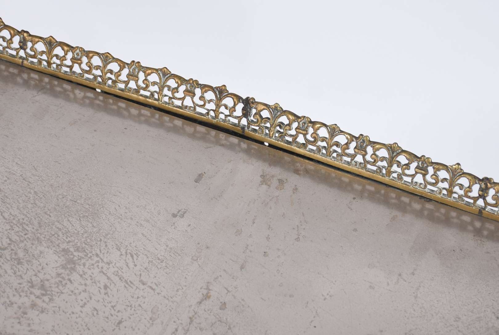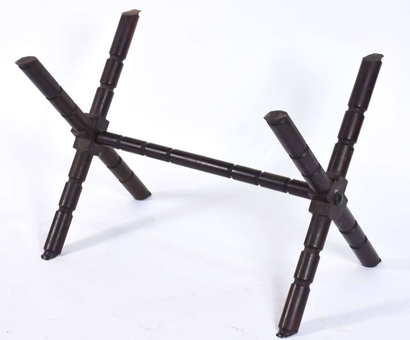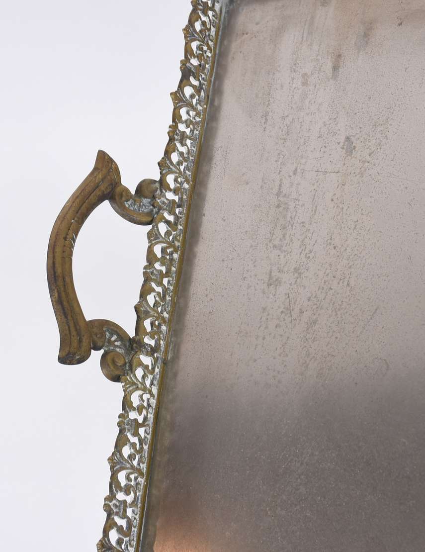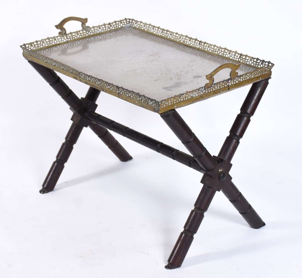 Mesa cavalete com base de madeira e tabuleiro de metal com alças e galeria vazada (fundo solto precisando soldar).