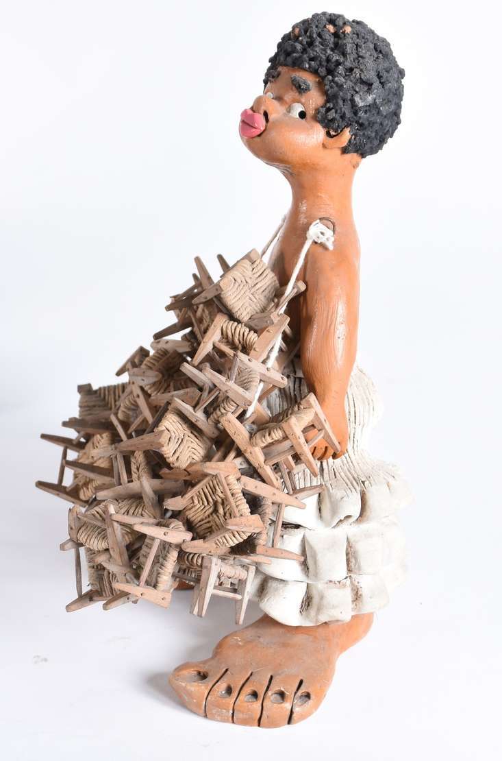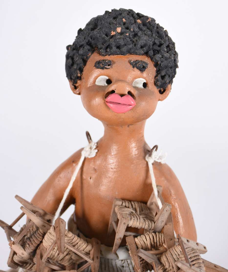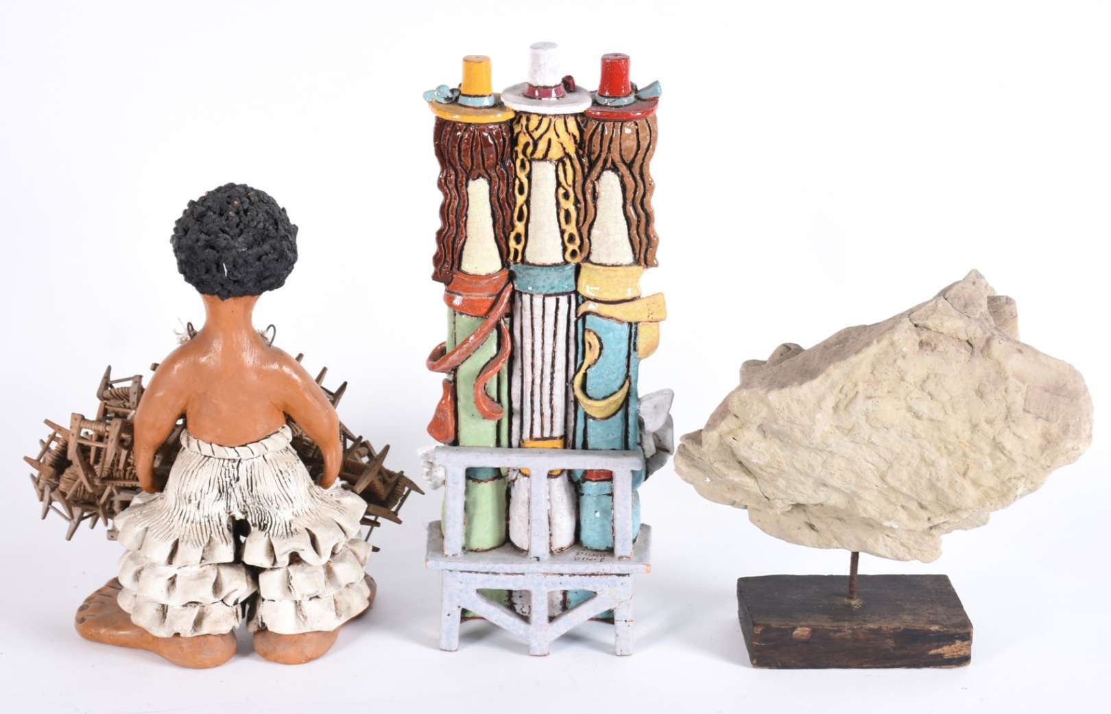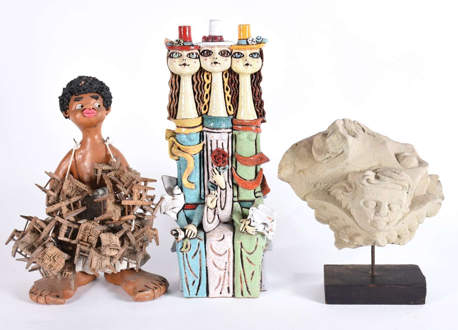Tres esculturas diversas, sendo uma de cerâmica policromada assinada Pinho Dinis (pássaro com asas coladas); uma de Arte Popular de cerâmica e madeira representando vendedor de cadeiras e, cabeça de anjo de material calcário.