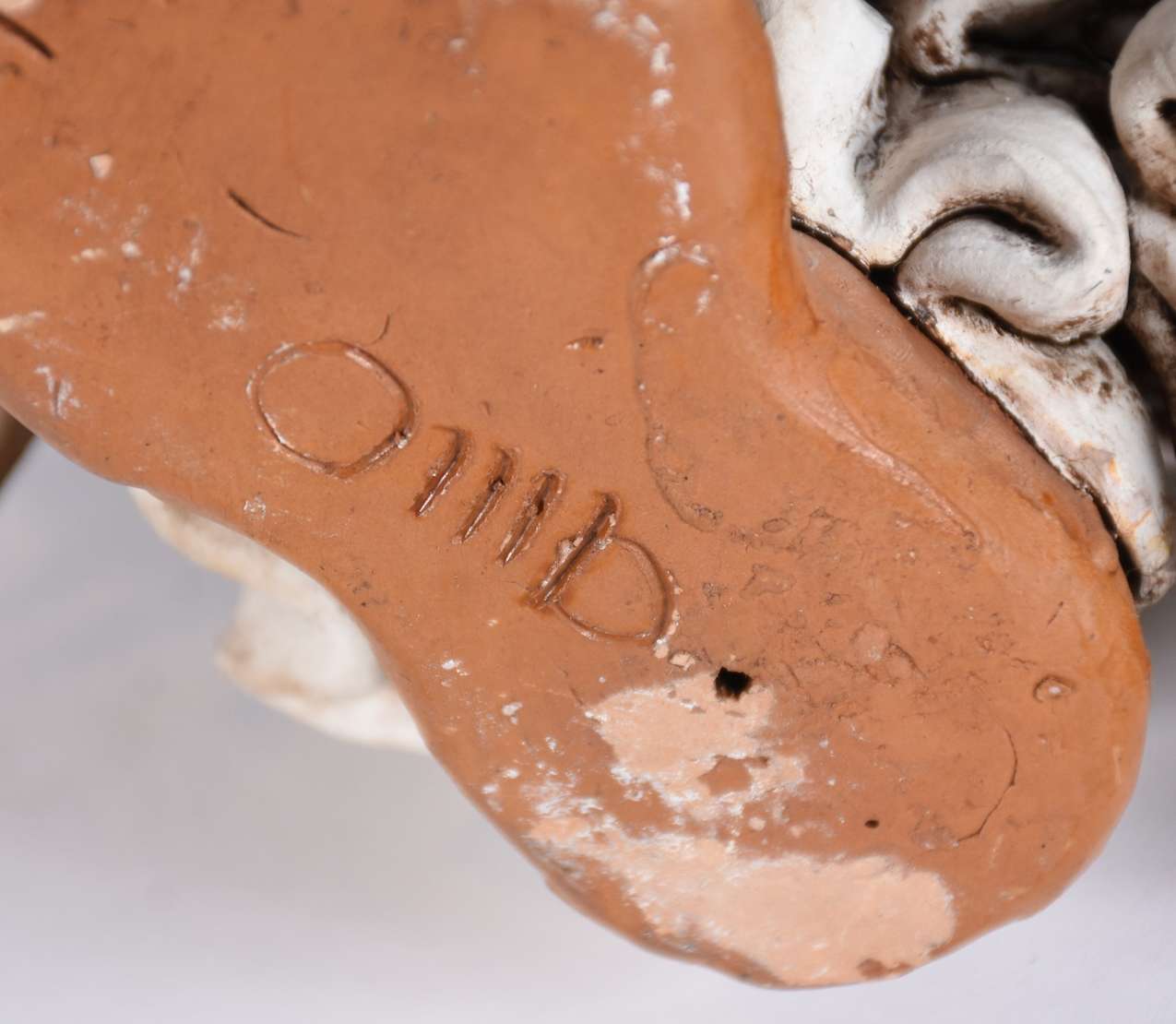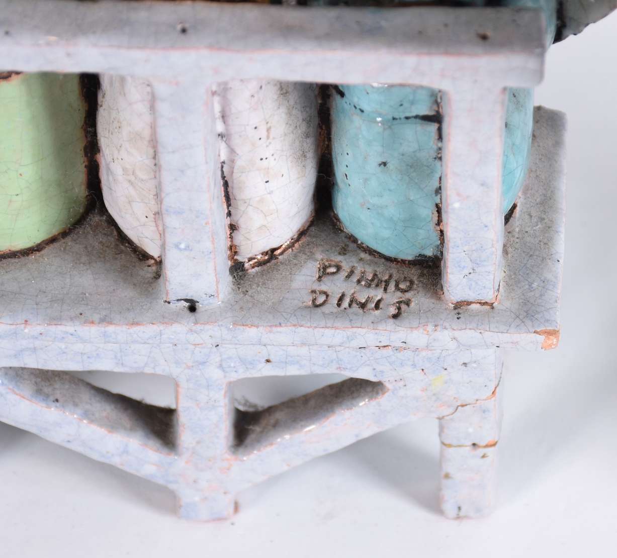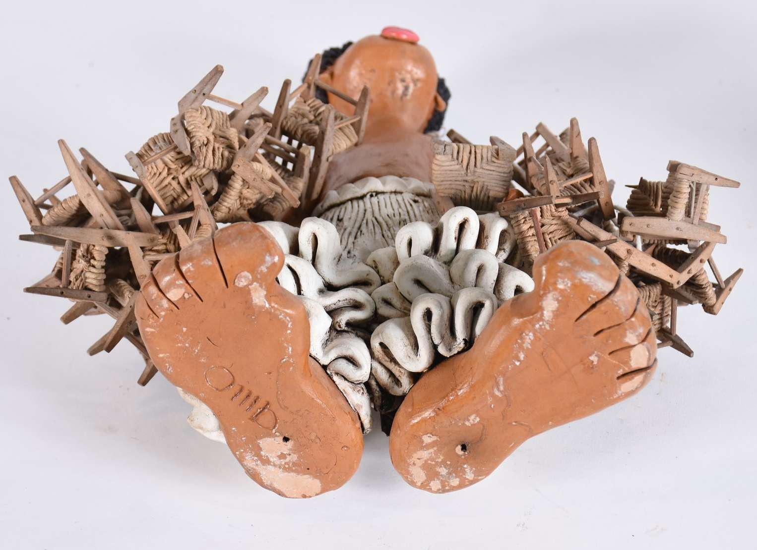 Tres esculturas diversas, sendo uma de cerâmica policromada assinada Pinho Dinis (pássaro com asas coladas); uma de Arte Popular de cerâmica e madeira representando vendedor de cadeiras e, cabeça de anjo de material calcário.
