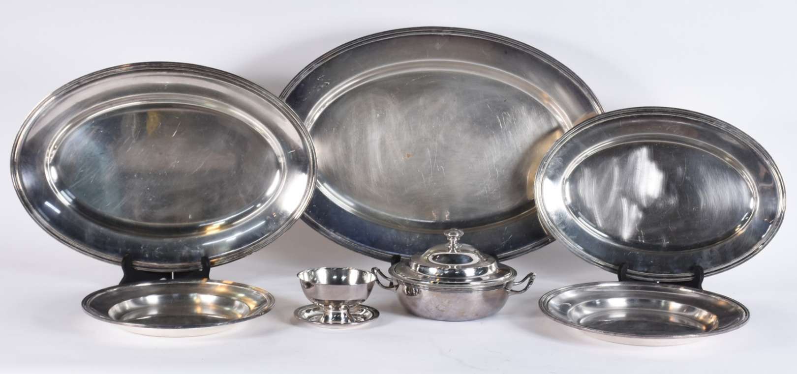 Baixela de metal prateado Fracalanza composto de: sopeira, legumeira,molheira, prato, petisqueira e 6 travessas sendo...