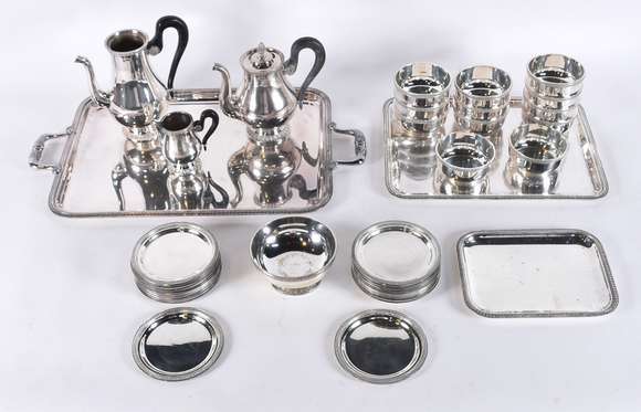 Diversas peças de metal prateado, sendo Baixela de chá com 2 bules (um sem a tampa), leiteira e bandeja com alças; Ba...