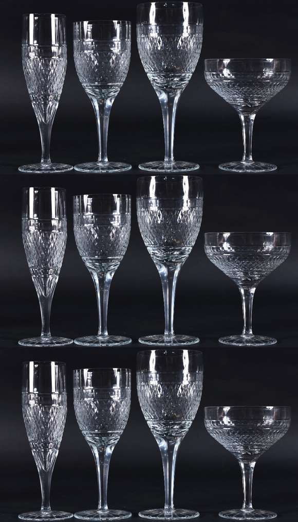 Conjunto de taças de cristal lapidação bico de jaca, pés altos facetados, composto de:8 para vinho branco,8 para vinh...