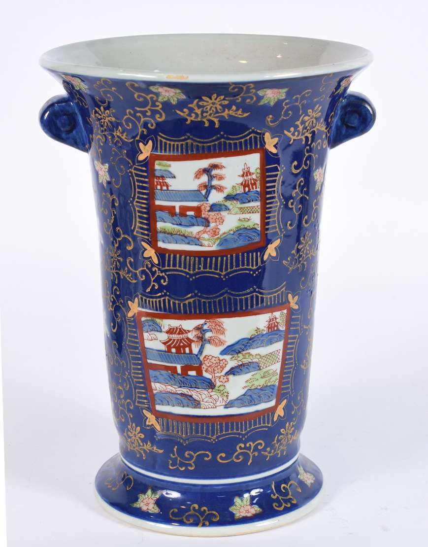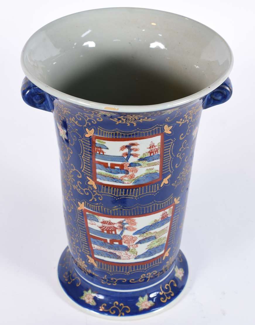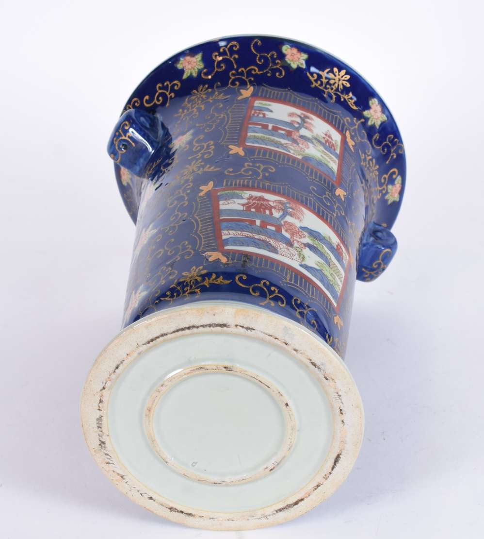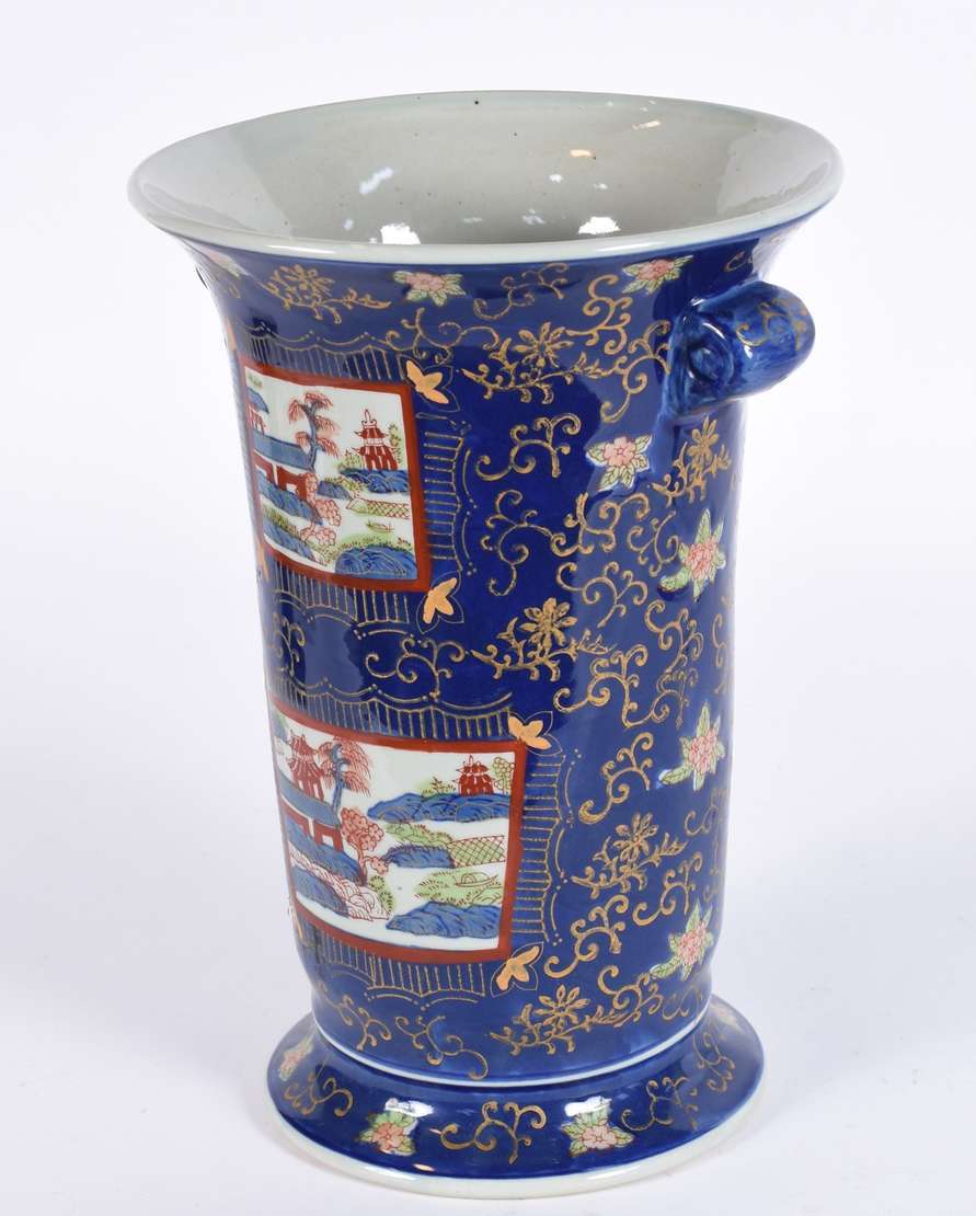 Vaso de porcelana alemã de Meissen decorado com flores em policromia e bordas em azul cobalto com realces dourados.