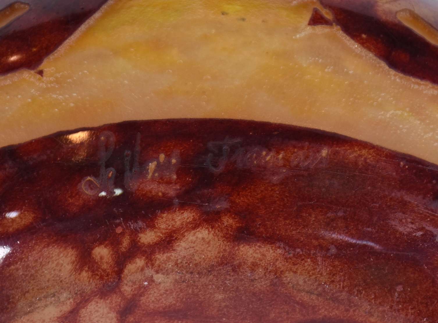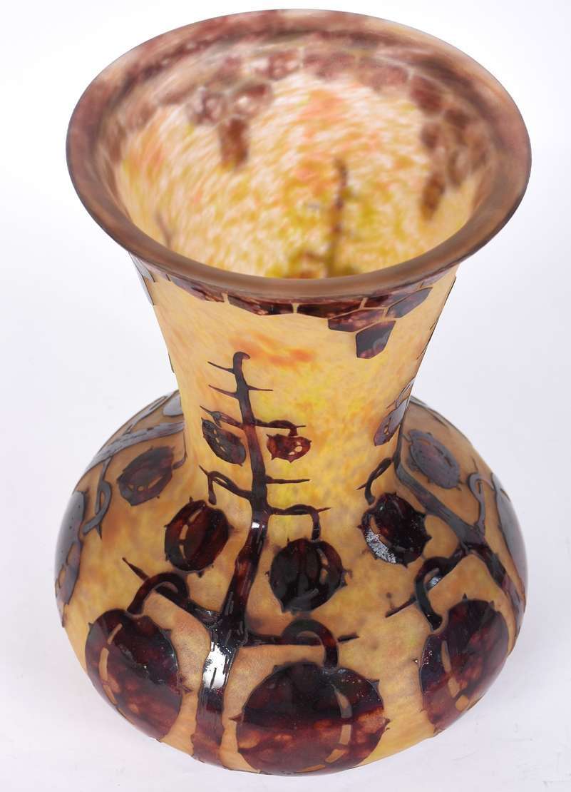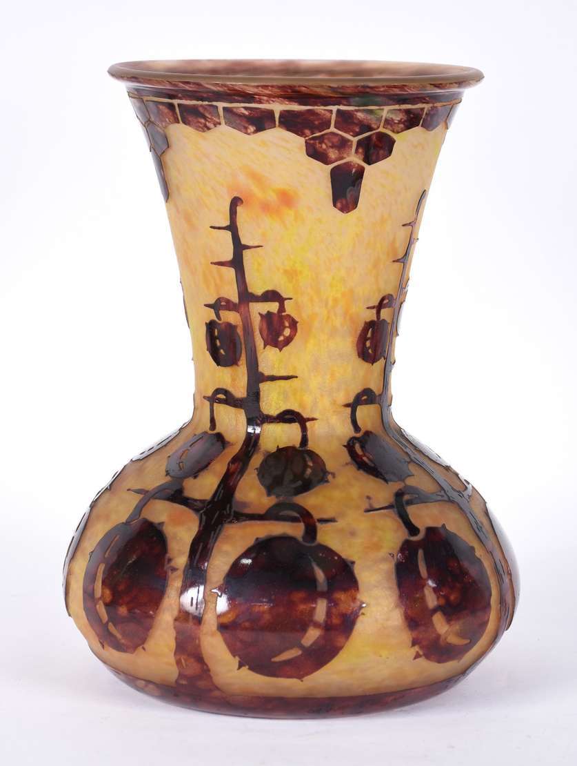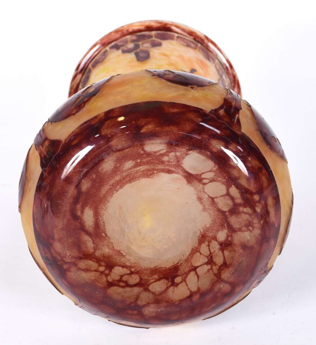 Vaso de pasta de vidro ART DECO na cor âmbar com flores estilizadas. Assinado.