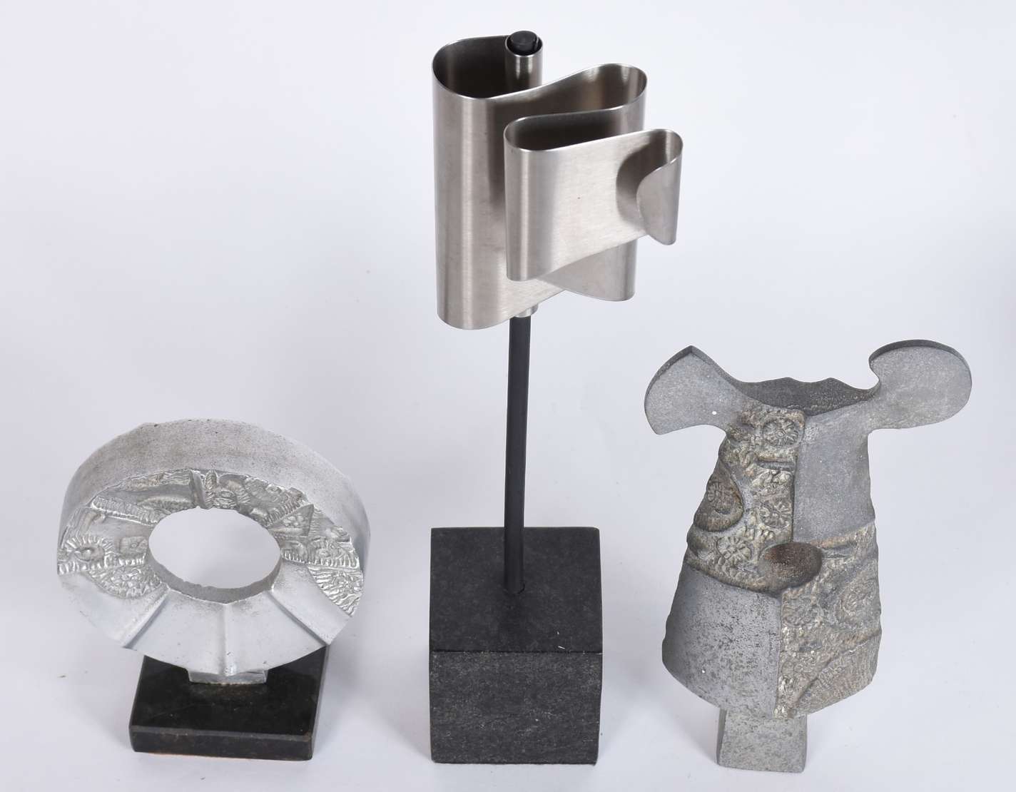 Tres esculturas diversas, sendo uma de cerâmica policromada assinada Pinho Dinis (pássaro com asas coladas); uma de A...