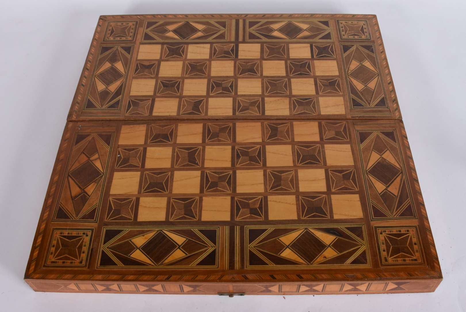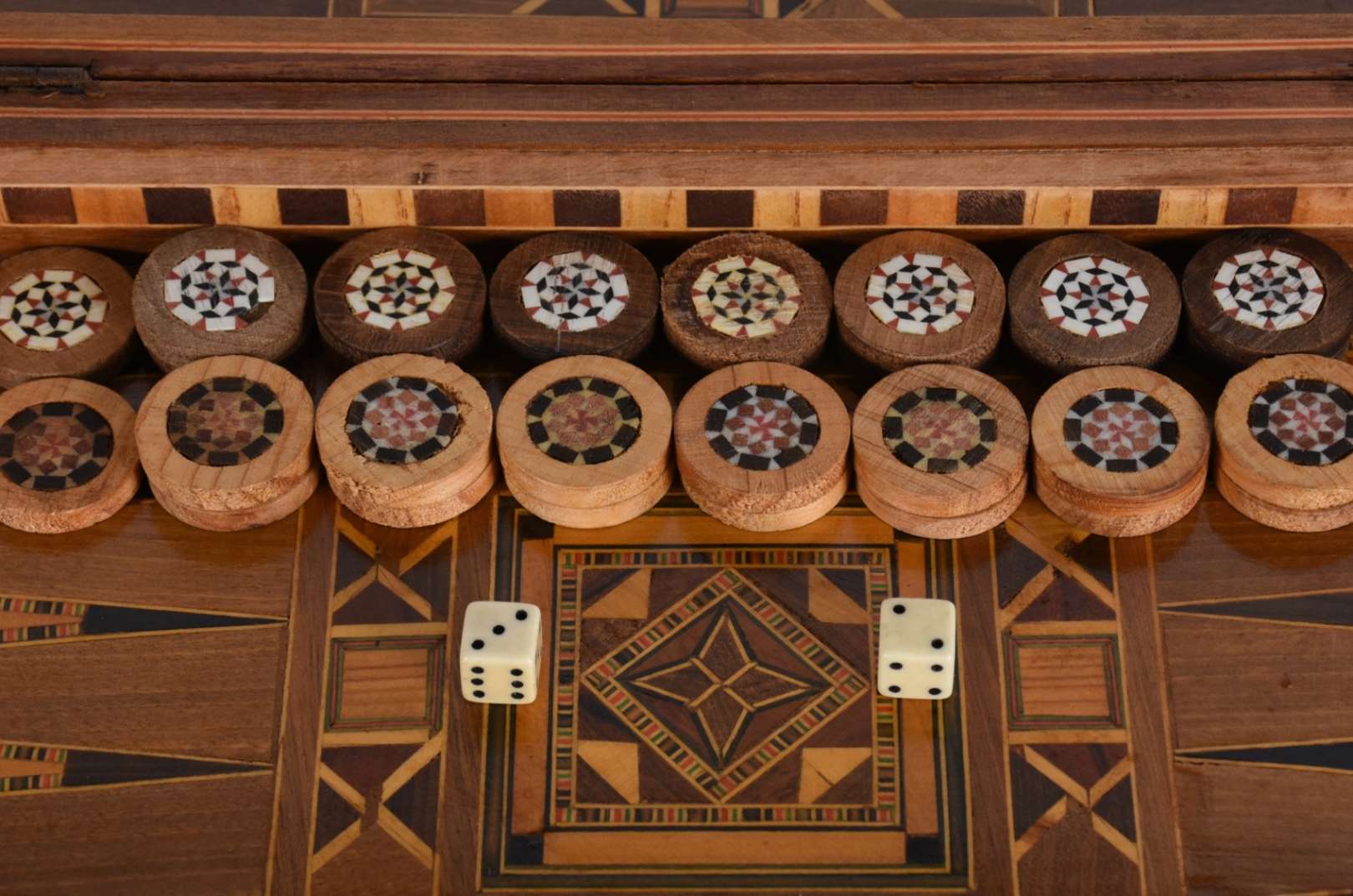 Tabuleiro para Jogo de gamão de madeira marchetada, defeitos na borda. Acompanham peças em preto e branco.