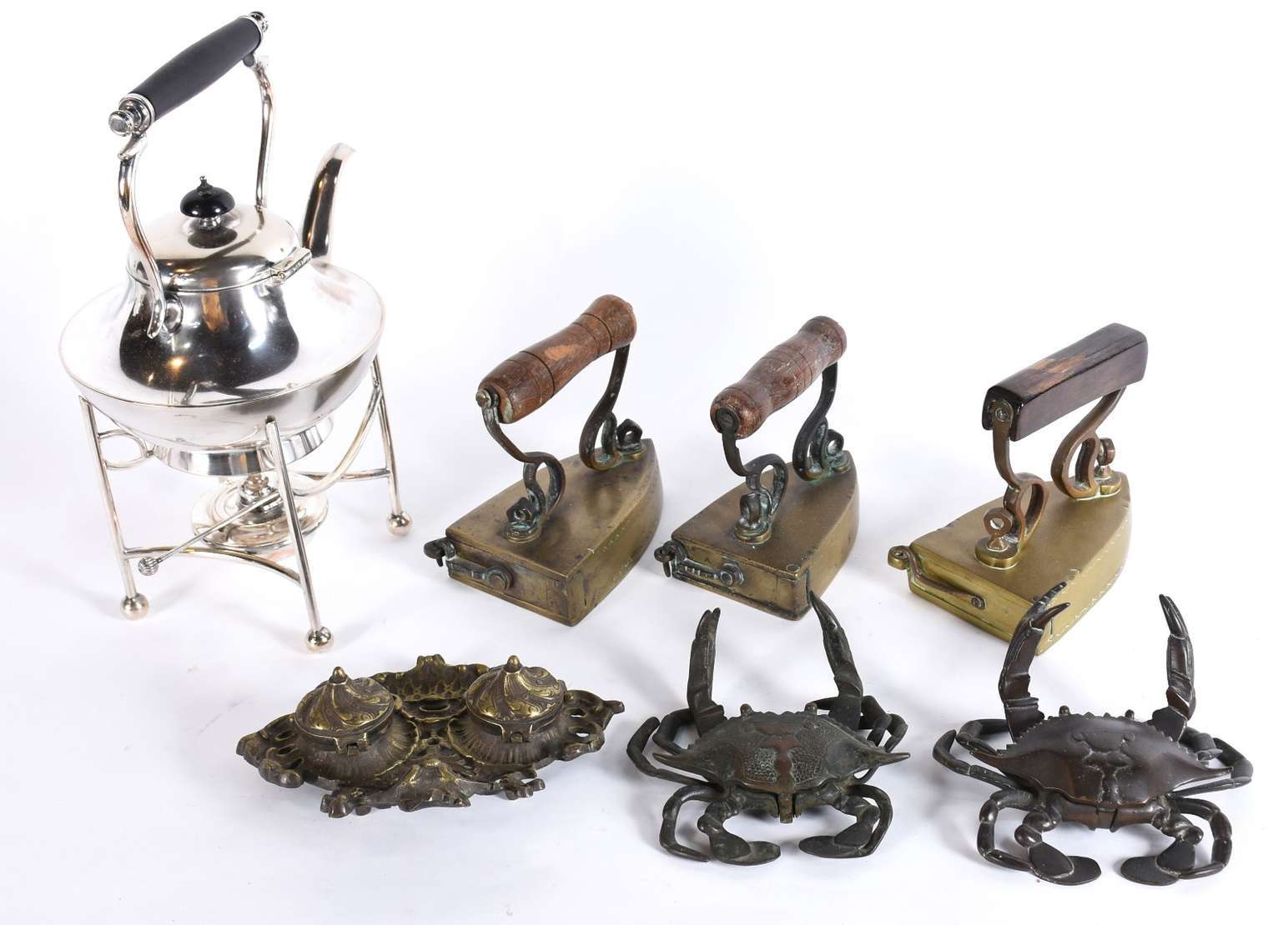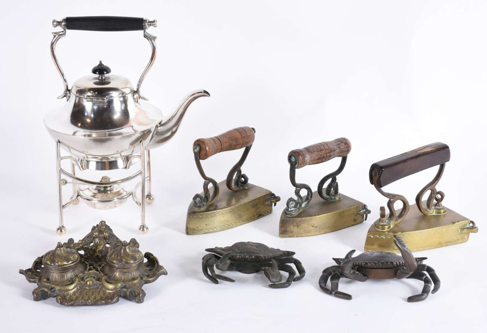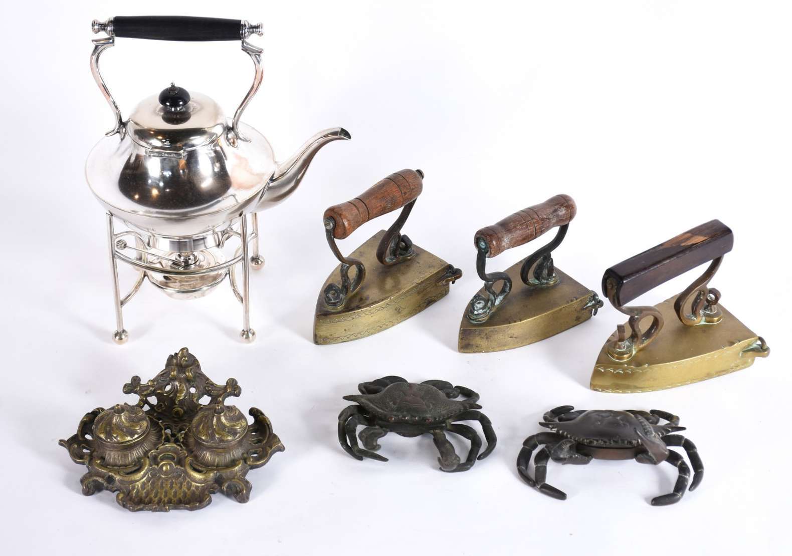 Diversas peças de metal prateado e vidro, sendo: galheteiro Christofle, 8 descansos para copo de metal prateado Chris...