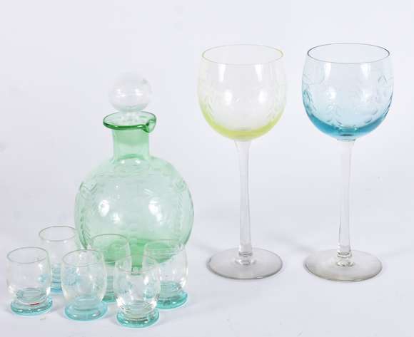Conjunto de licoreira com 6 copinhos de vidro na cor verde e 2 cálices de pé alto para vinho. Total: 9 peças.