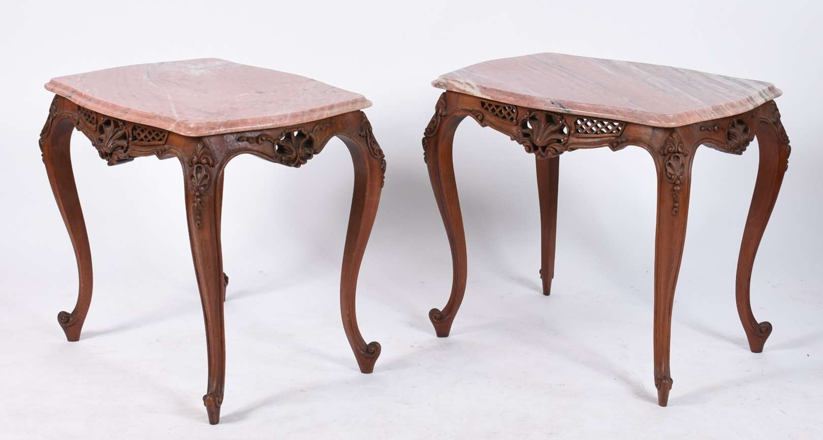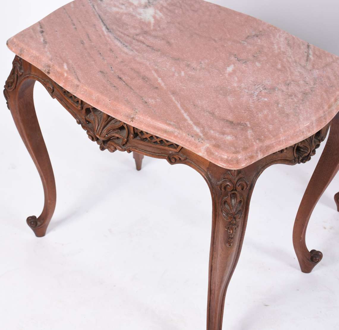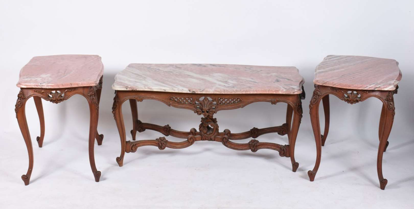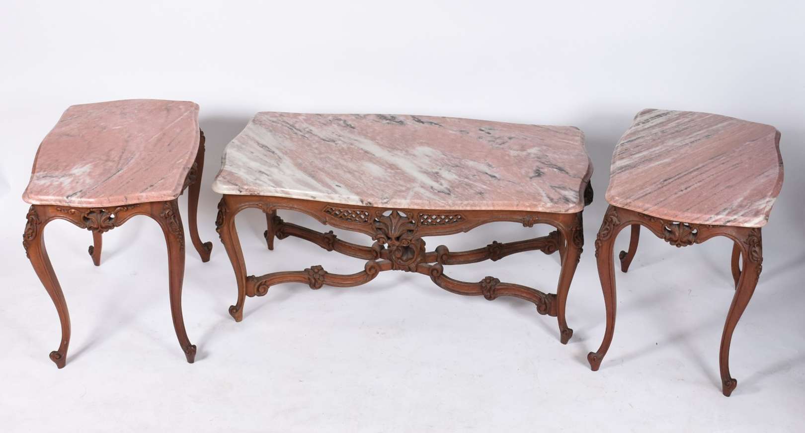 Mesa ninho de madeira nobre com 3 peças, bordas frisadas e pernas ligeiramente recurvas ao gosto Chipendale.