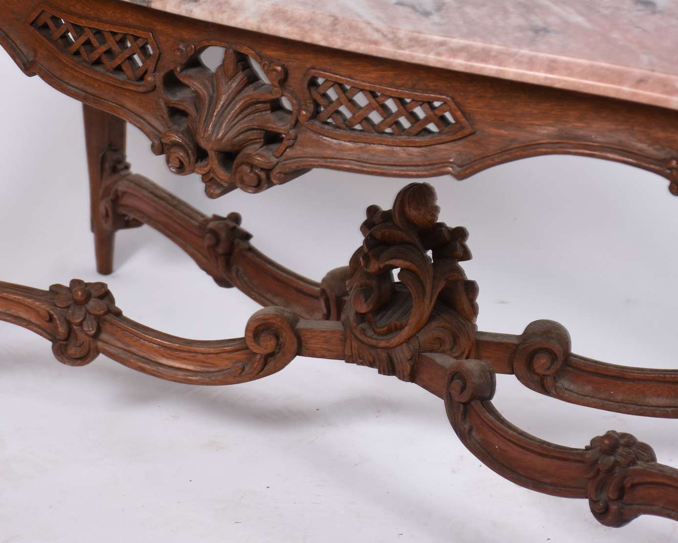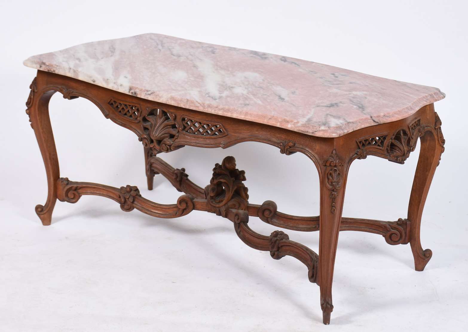 Mesa de centro de madeira nobre, saia recortada com detalhes vazados, tampo recoberto por vidro.