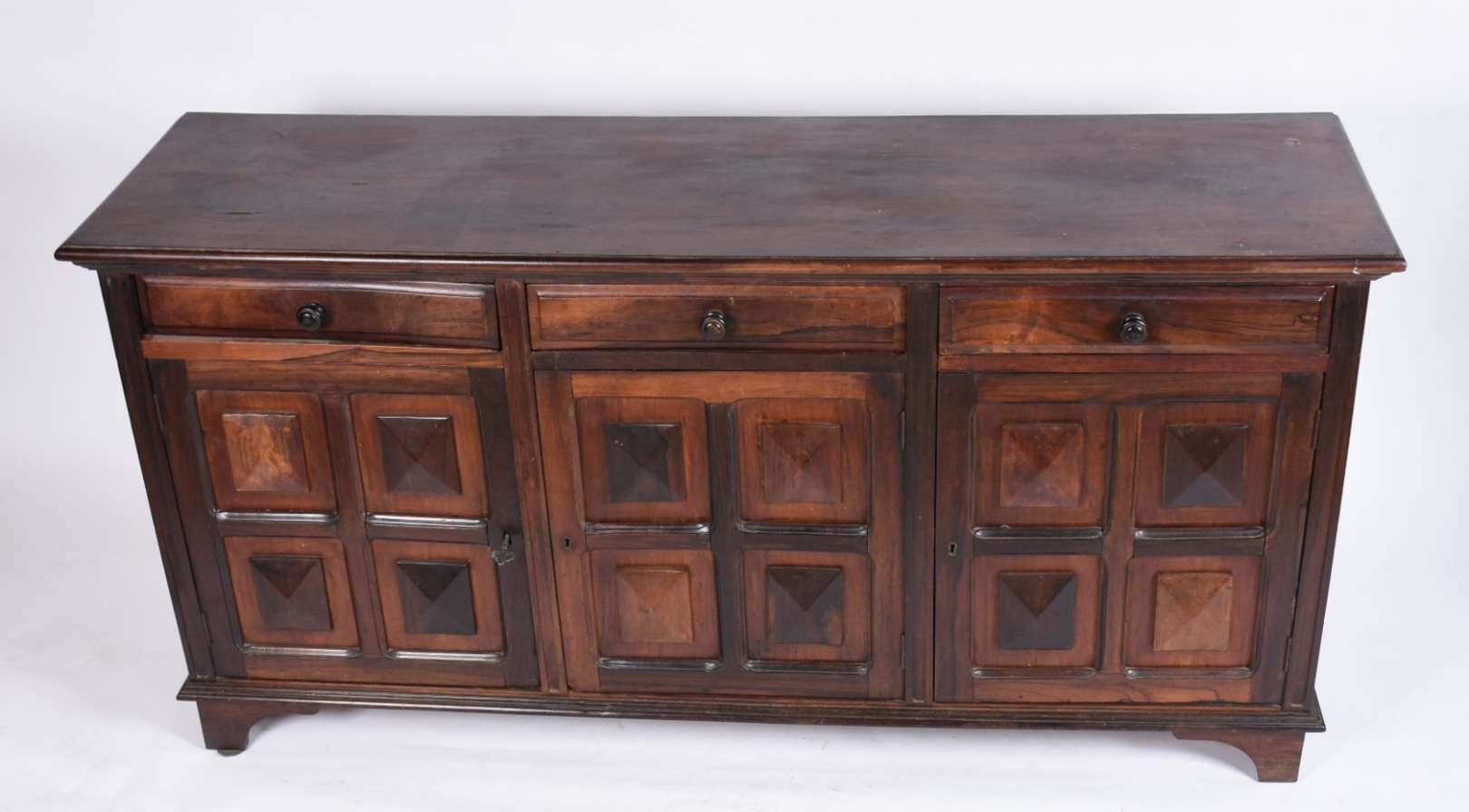 Buffet de madeira nobre com tres portas e tres gavetas almofadadas, prateleiras internas.