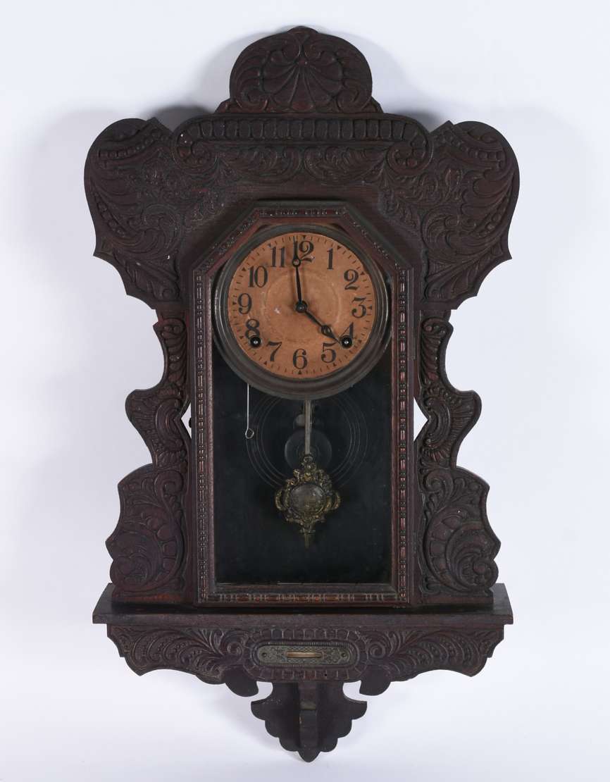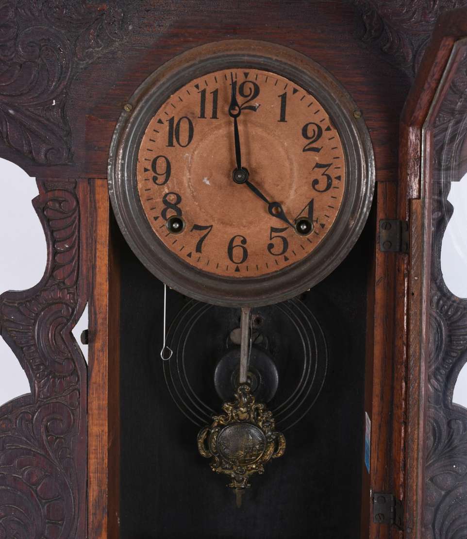 Relógio de parede com caixa de madeira feitio oitavado (funcionando).