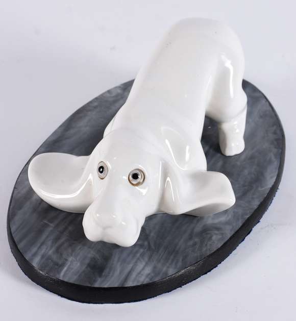 Estatueta de porcelana representando Basset, olhos de opalina.