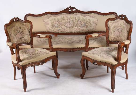 Conjunto de sofá e par de cadeiras de madeira nobre, estilo Luis XV, forração em gobelain, uma das cadeiras com braço...