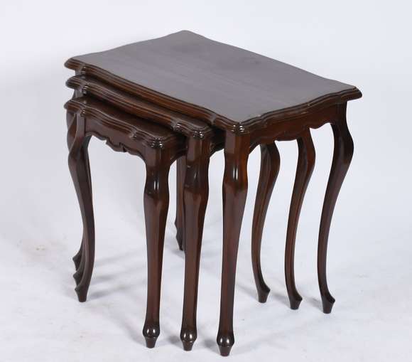 Mesa ninho de madeira nobre com 3 peças, bordas frisadas e pernas ligeiramente recurvas ao gosto Chipendale.