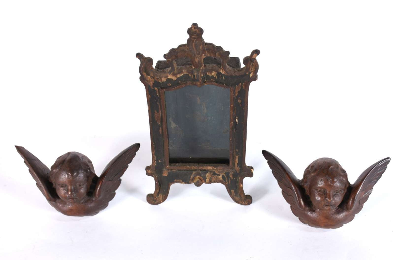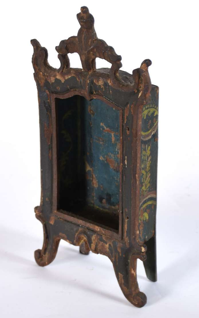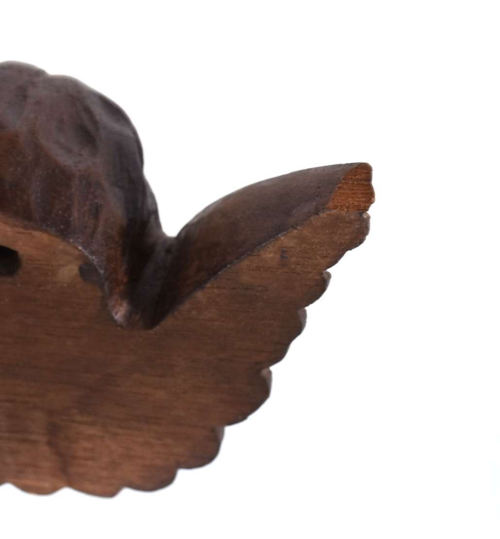 Relógio de parede com caixa de madeira entalhada feitio capelinha, pêndulo com figura de castelo.