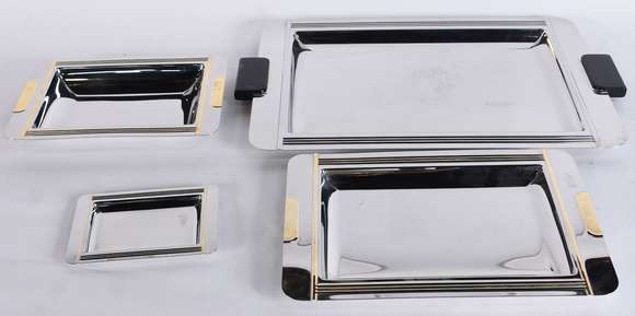 Diversas peças de metal prateado, sendo: 2 porta pirex, 3 bandejas e porta petiscos. Total: 6 peças.
